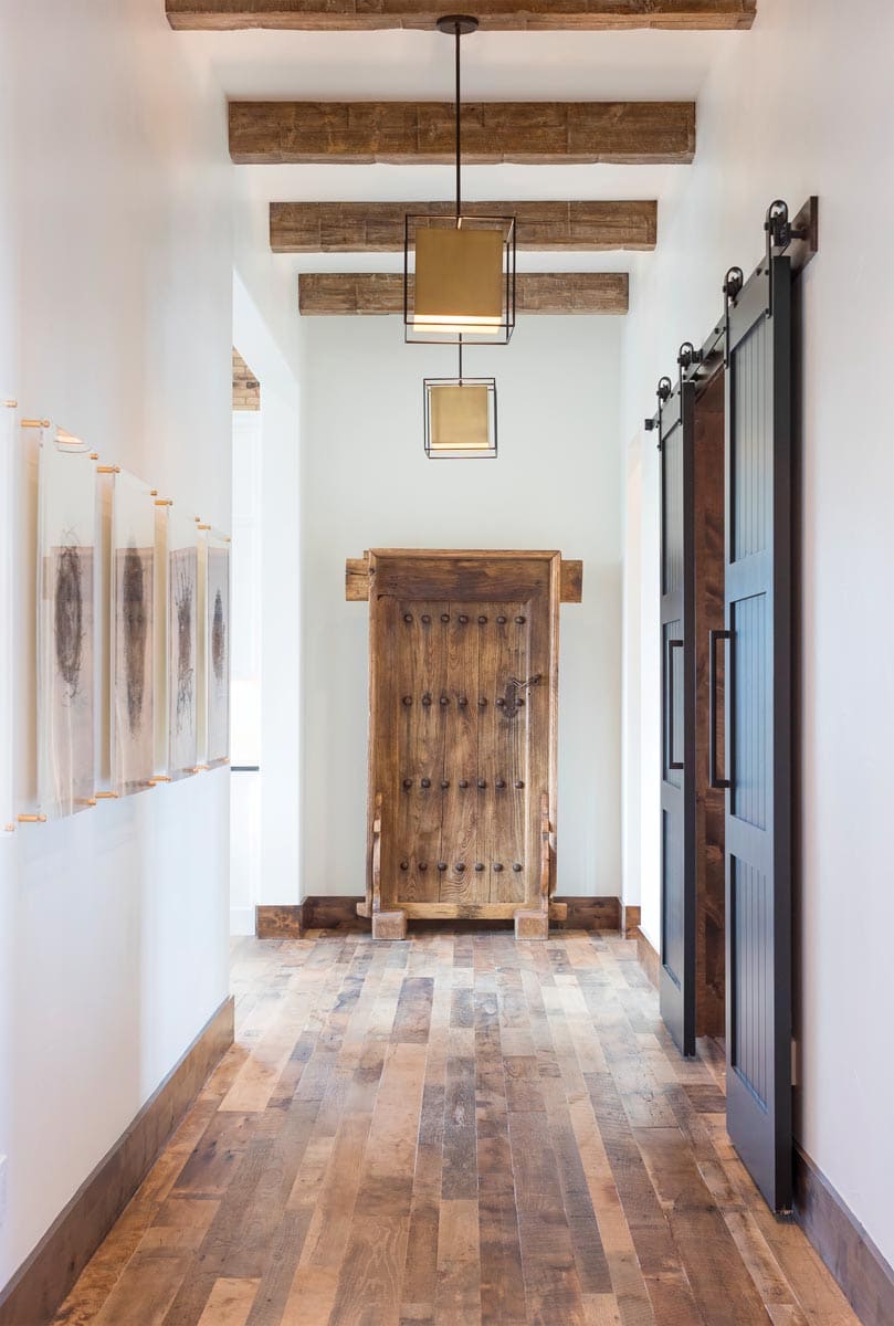 Long hallways extend from the foyer, with geometric pendants featuring gold-tone metal shades hanging from the beamed ceiling. Acrylic frames with gold hardware showcase black and white photographs of bird nests. An antique elm door, more than 100 years old, was salvaged from a small village in China and now serves as an impressive art piece. Behind the sliding black doors is Steve’s home office.