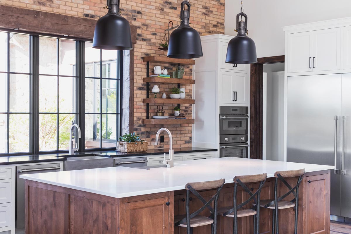 The Aguileras took their design and color cues from the materials: the floor, the brick accents, the wood beams, the black-framed windows. Open the massive entry door and you’re greeted with a spacious foyer that’s refreshingly uncluttered. Instead, your gaze goes directly to the outdoors, visible through the glass-and-metal French doors opposite the front entrance, and then to the artfully arched brick-faced barrel ceiling.