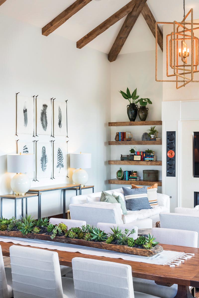 The open-concept living room features a custom-made hand-distressed dining table topped with an antique Turkish dough riser filled with succulents. Slip-covered Cisco Brothers sofas are piled with plush Libeco Home pillows covered in Belgian linen. The floating shelves feature everything from antique Italian olive jars to a vintage iron hat box. The feather photographs are printed on handmade paper and hang between leather cords. Aguilera chose an oversize jute-covered chandelier from Sally Lynn Home to balance the vaulted ceiling.