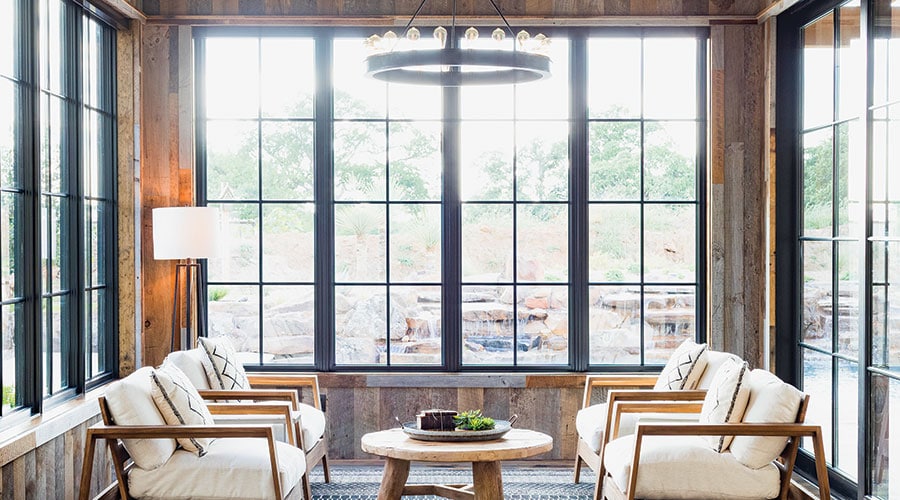 Reclaimed wood floors from Fort Worth’s Bottega Design Gallery set the casual tone with their worn look, random-size planks and age “spots.” A natural stain adds a layer of protection but doesn’t detract from the wood’s blemished beauty.