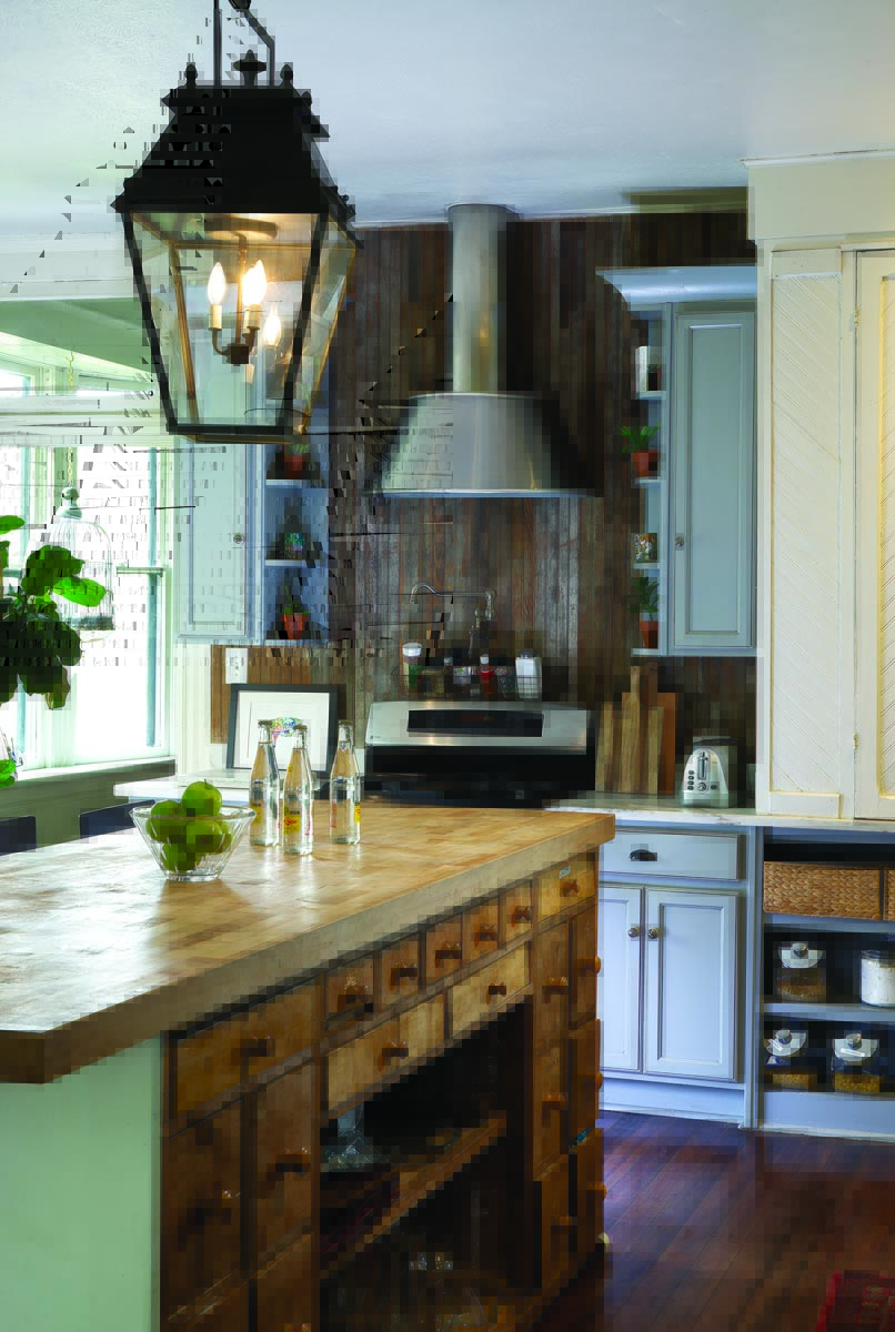 The updated kitchen retains a historic charm thanks to a backsplash using repurposed beadboard and an island crafted from a vintage storage piece topped with a large slab of butcher block.