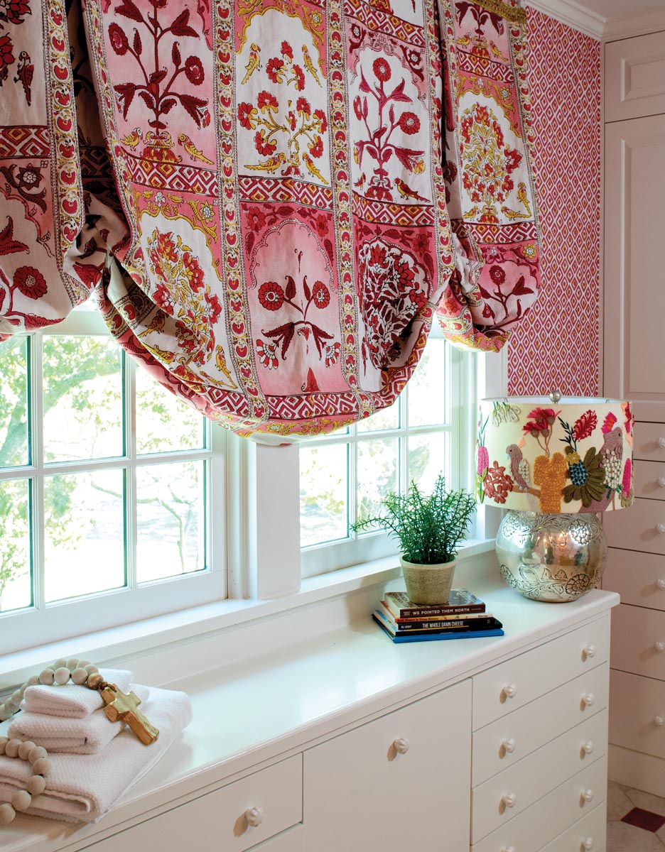 Sherri’s interests are on view throughout the first floor of the home, from a bountiful collection of vintage Tlaquepaque pottery to ranks of cap pistols and stamped-silver boxes. Blown-glass barware fills glass-fronted custom cabinets above a bar accented with hammered copper. And now, her love of folk art and textiles fills the second floor, too. “Sherri’s style is color, color and more color, always with a sense of humor and a little surprise. She fearlessly combines fine antiques with Mexican street market finds,” says Becky, a designer for the federal government, who is delighted to work with clients who embrace bold interiors.