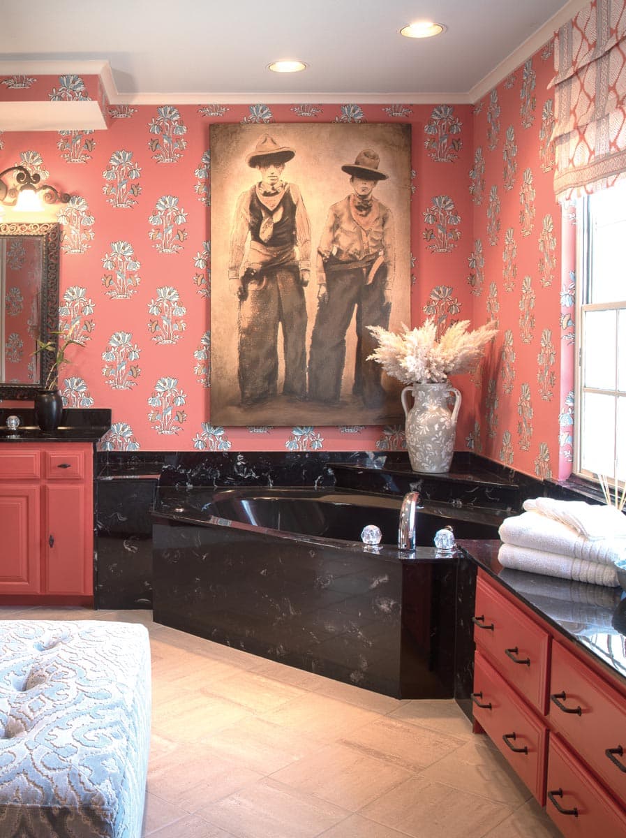 Pendleton blankets in the Cowgirl Room inspire the blue and faded-red color scheme. The seasoned look of a classic Ralph Lauren ticking wallcovering is a chic match for the cowboy bark-cloth draperies. Old suitcases at the end of each bed hold extra linens. En suite baths feature covetable Thibaut wallcoverings and textiles, but the Cowgirl’s huge red and black bathroom is the showstopper. Rather than eliminate the formerly all-black color scheme, Becky balanced the black soaking tub and counters with a coral Thibaut Lily Flower wallpaper, a pattern based on a vintage Mexican textile. An oversize ottoman newly upholstered in a gray-blue cut velvet gives the space the feel of an indulgent spa.
