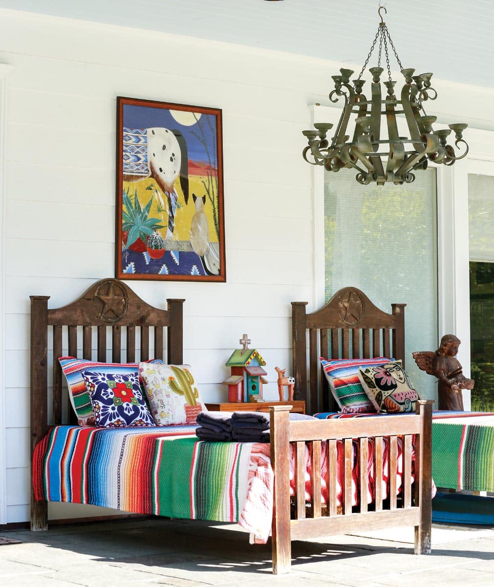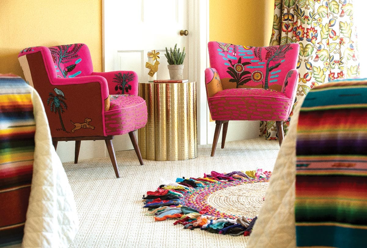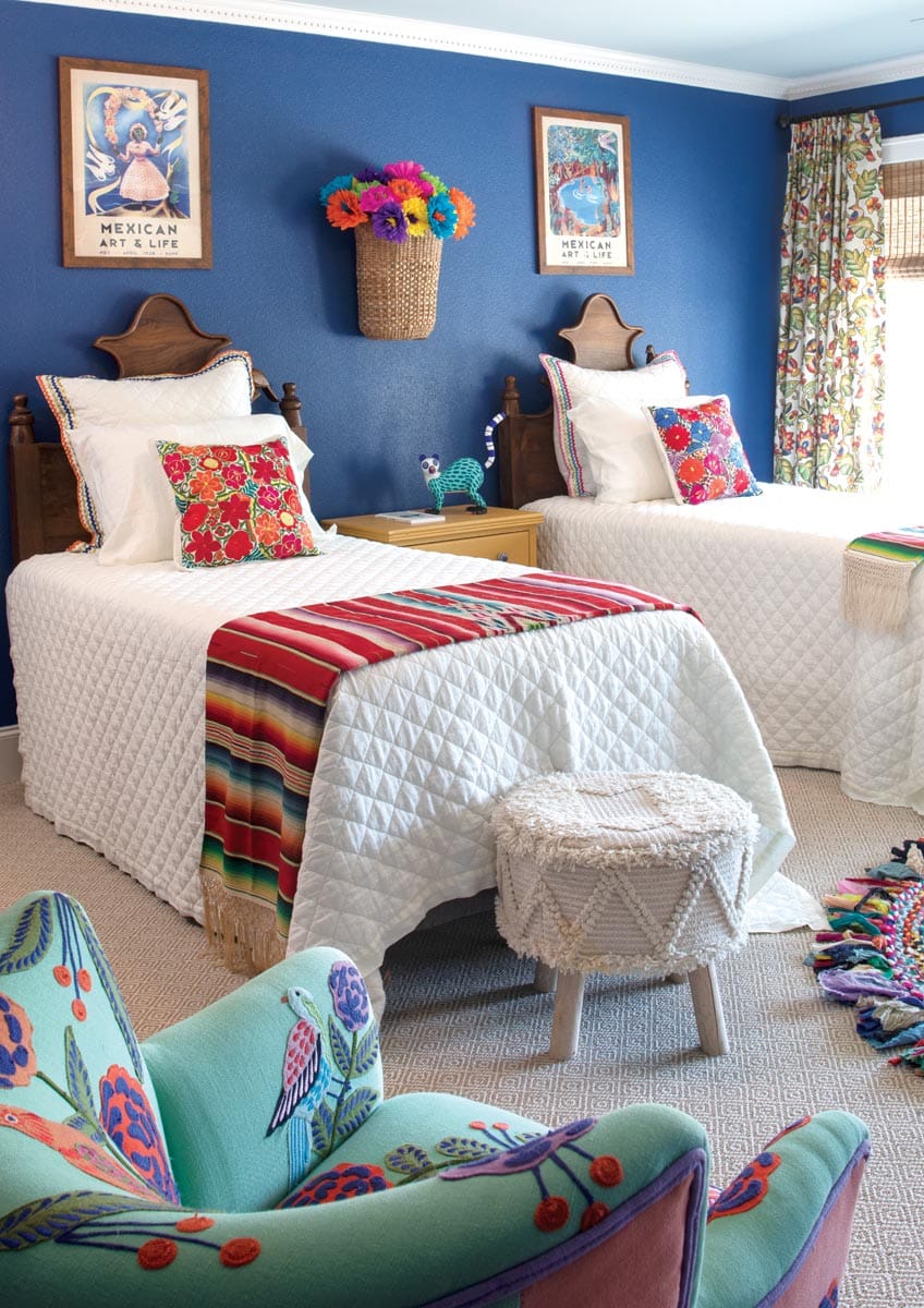 In the Yellow Room, colorful drapes feature a Mexican folk art motif that mirrors the carved bird detail on the headboards of the twin beds. White linen pillow shams customized with colorful rickrack trim are reminiscent of Mexican folk dancers’ skirts; framed Mexican magazine covers from the ’30s further set the scene. The adjacent Blue Room also celebrates similar textiles and folk art motifs, and both rooms are enlivened by round jute rugs interwoven with colorful chindi cotton braids