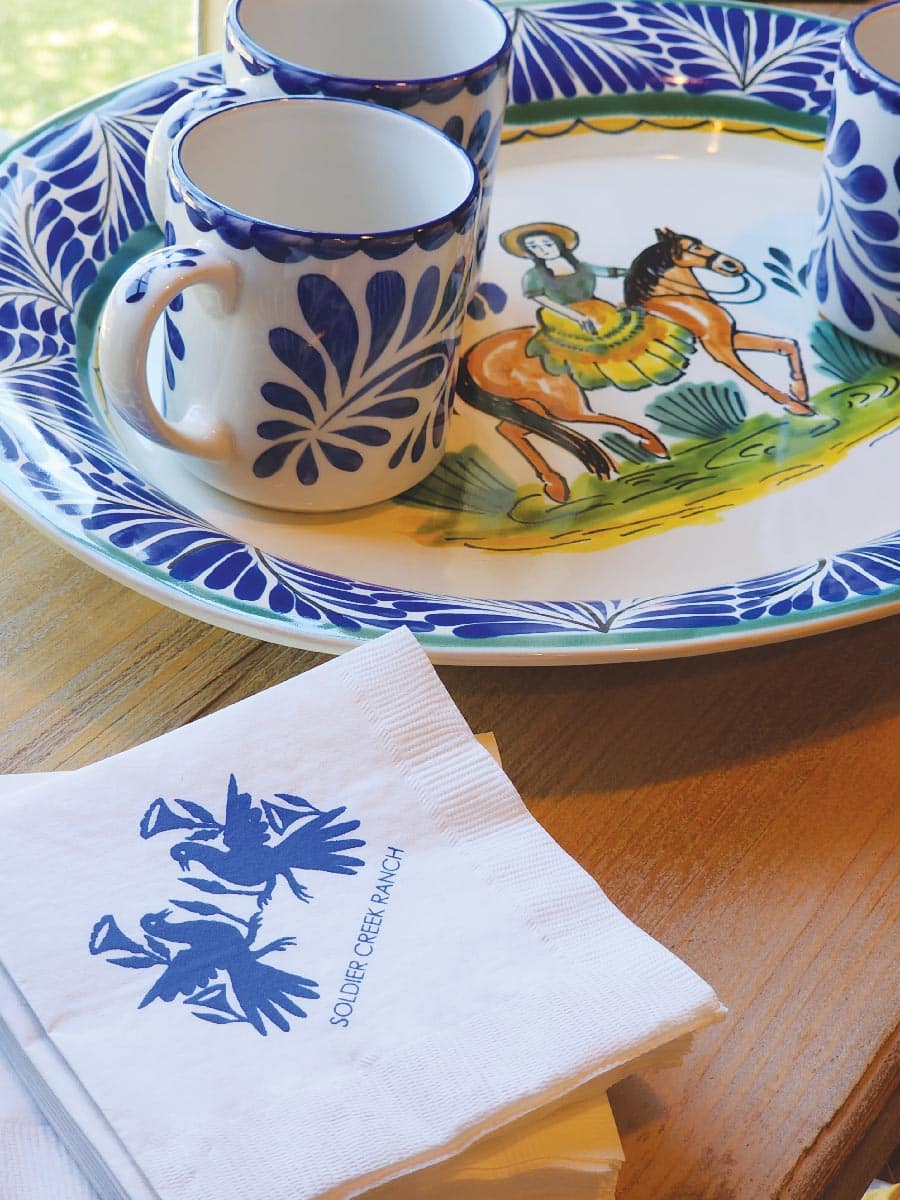Amplifying the luxury-inn sensibility, the guest wing’s central sitting room features four cream-colored boucle-upholstered lounge chairs that invite gathering for coffee or cocktails. A patchwork kilim rug with soft, faded colors centers the space; displays of Mexican pottery echo its tones. Everywhere, artworks reflect David and Sherri’s support for locals such as Greg Westfall, whose acrylic monoprints of an Indian chief and a coyote grace the second floor.