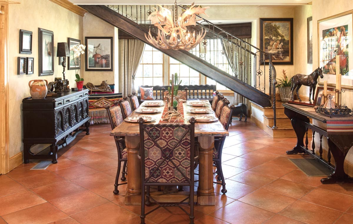 Upstairs and down, inside and out, the ranch is ready for Sherri’s anticipated gatherings. There’s plenty to entertain guests, from swimming to deer- and bird-watching (including flocks of wild turkeys). A drove of five donkeys known by name and disposition, two elderly cows, a retired horse, dogs, cats and chickens round out the menagerie. Dozens of life-size bronzes of wildlife accent outdoor spaces, too — gifts the Joneses gave to each other over the years.