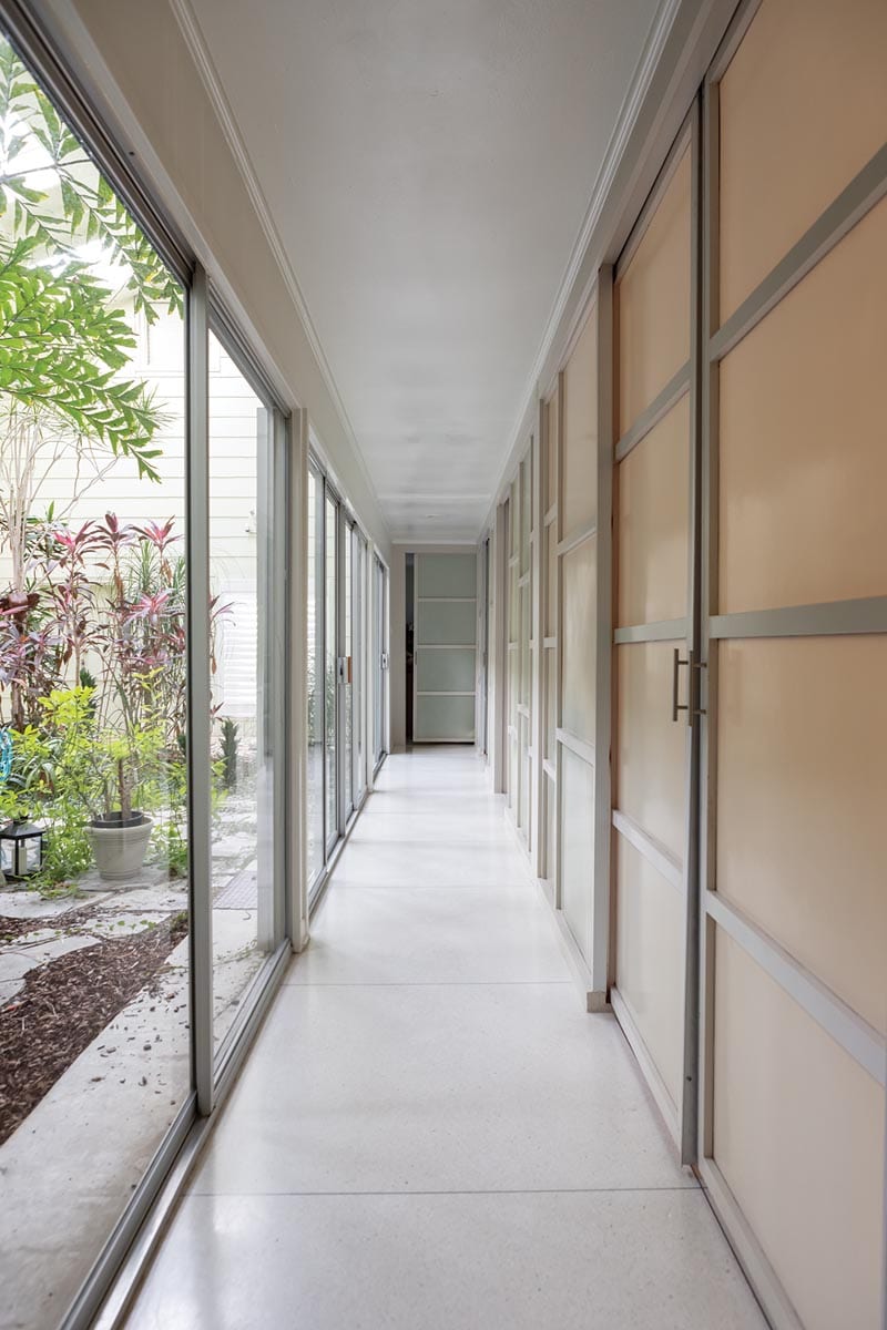 The provenance of the house, including the architect, is a bit of a mystery. But the Samples appreciate the built-in storage, the wraparound design and quirky features such as the bedrooms’ Shoji-style sliding doors, which open to views of the atrium.