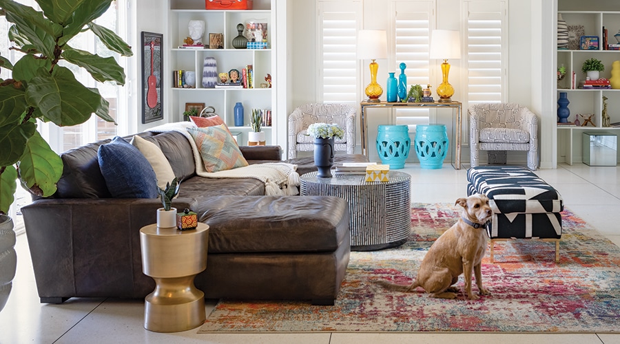 The open living room gave Shauna and her team plenty to work with. She kept an existing leather sectional, beloved by the household’s people and pets, and anchored it with a colorful rug to create the main sitting area. A space between two built-in bookshelves became home to a console table, ideal for showcasing a pair of vintage lamps that once belonged to Carrie’s grandfather. Accent chairs in a subtle black-and-white geometric print flank the table. The chairs can be pulled out for extra seating. Turquoise garden stools tucked under the console can be used elsewhere as side tables.