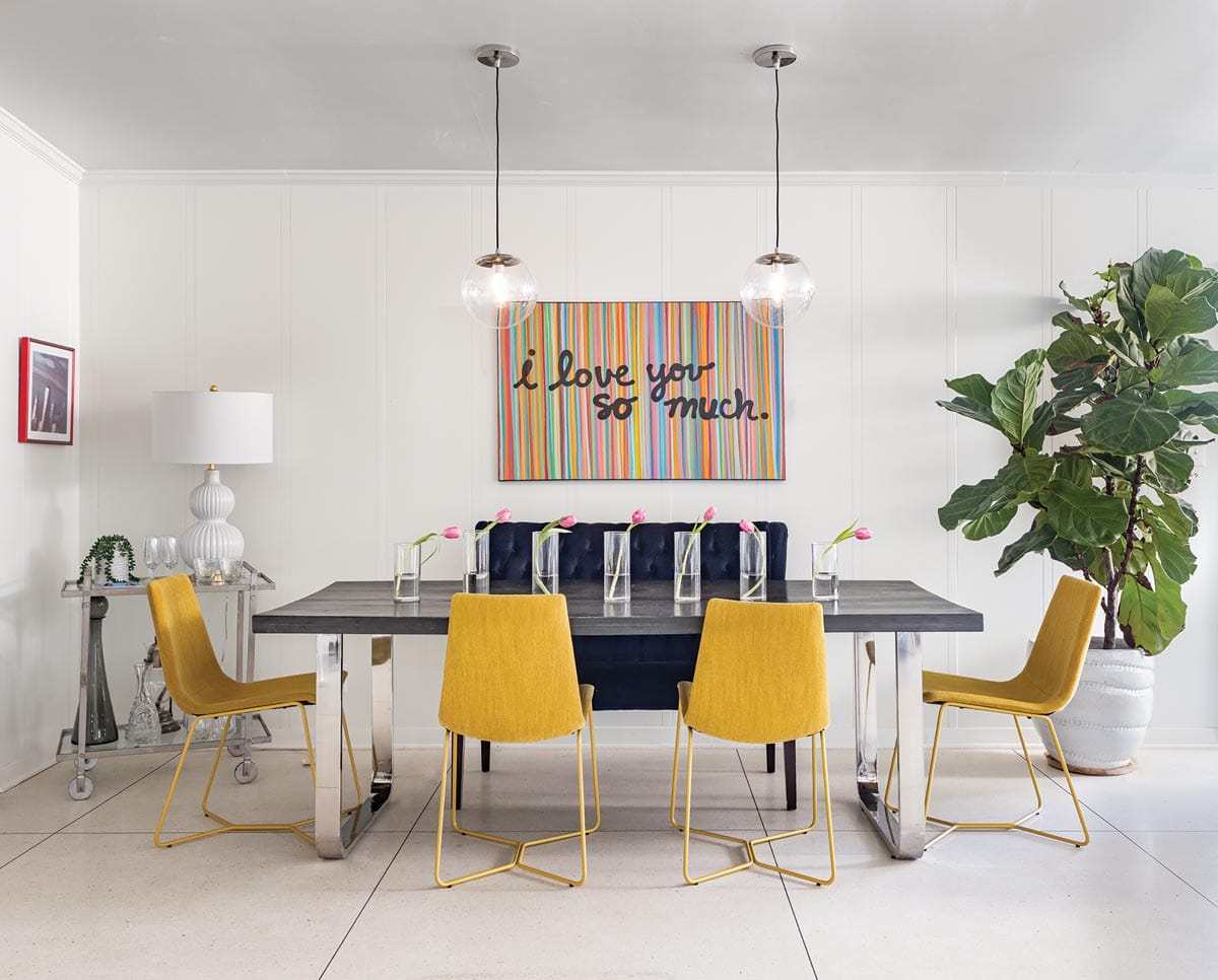 New dining room chairs in a bold gold from West Elm add color, as does the painting titled Love is Bold. The acrylic brushwork on a spray-painted background is from a Dallas artist known as Captain Casual. Carrie has named the large fiddle-leaf fig Evelyn. The potted plant helps define the living area from the dining space. A bar cart with vintage glassware is parked to the left.