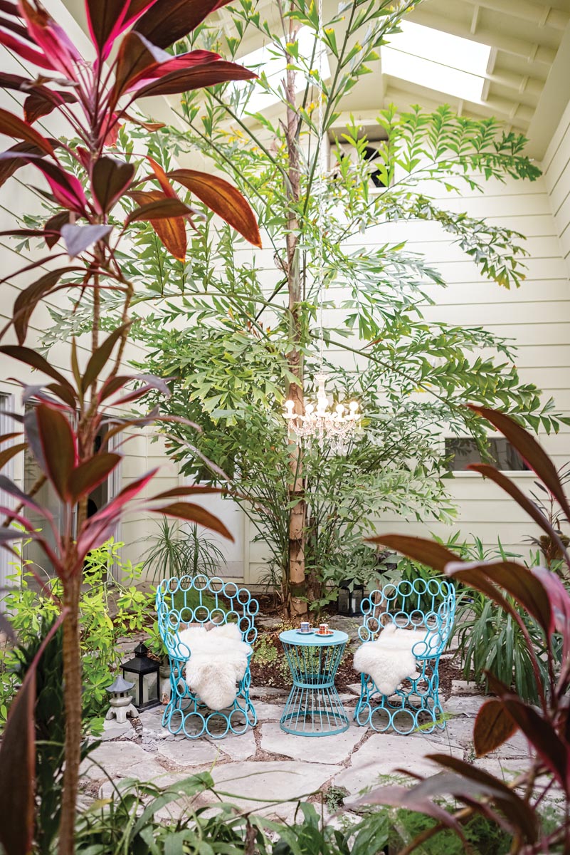 There’s also a 742-square-foot atrium with a vaulted ceiling in the middle of the house. Palm trees graze the skylights; ferns, ivy and a pencil cactus happily cohabitate. Flagstone covers the dirt, and water is available via a spigot inside the atrium, which is accessible from sliding glass doors in the main living area and in the hallway near the bedrooms. “I didn’t know too much about plants, but we’ve kept everything alive in there,” says Carrie.