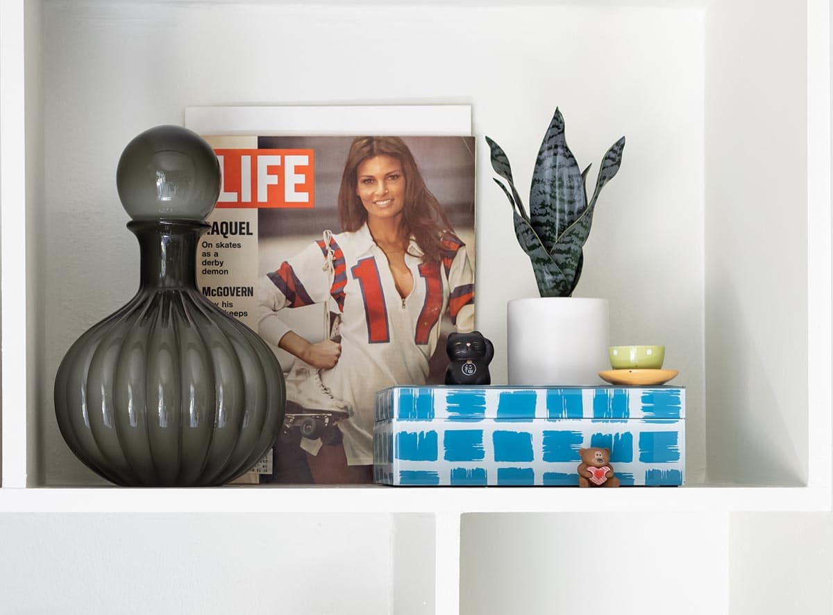 The bookshelves now showcase collectibles, such as Carrie’s copy of an old Life magazine cover featuring Raquel Welch wearing roller derby attire to promote her 1972 film Kansas City Bomber. To create a more distinct dining area, Shauna installed a pair of pendant lights over an existing table and added a half-dozen chairs from West Elm. The artwork comes from a Dallas artist known as Captain Casual. The kitchen features Formica-clad cabinets and a large island with plenty of room for the six counter stools. On the opposite side of the island is plentiful open storage space. The second phase of the design upgrade took place in the bedrooms.