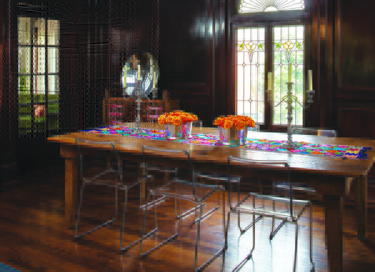 The living room is spacious enough to hold this long table built of old barn wood. Acrylic and chrome dining chairs allow the beauty of the wood to stand out. The table runner is from Mexico; the silver candelabras once belonged to Martha’s grandmother. A concave funhouse mirror sits atop a wooden chest from India, another find by Stacey.