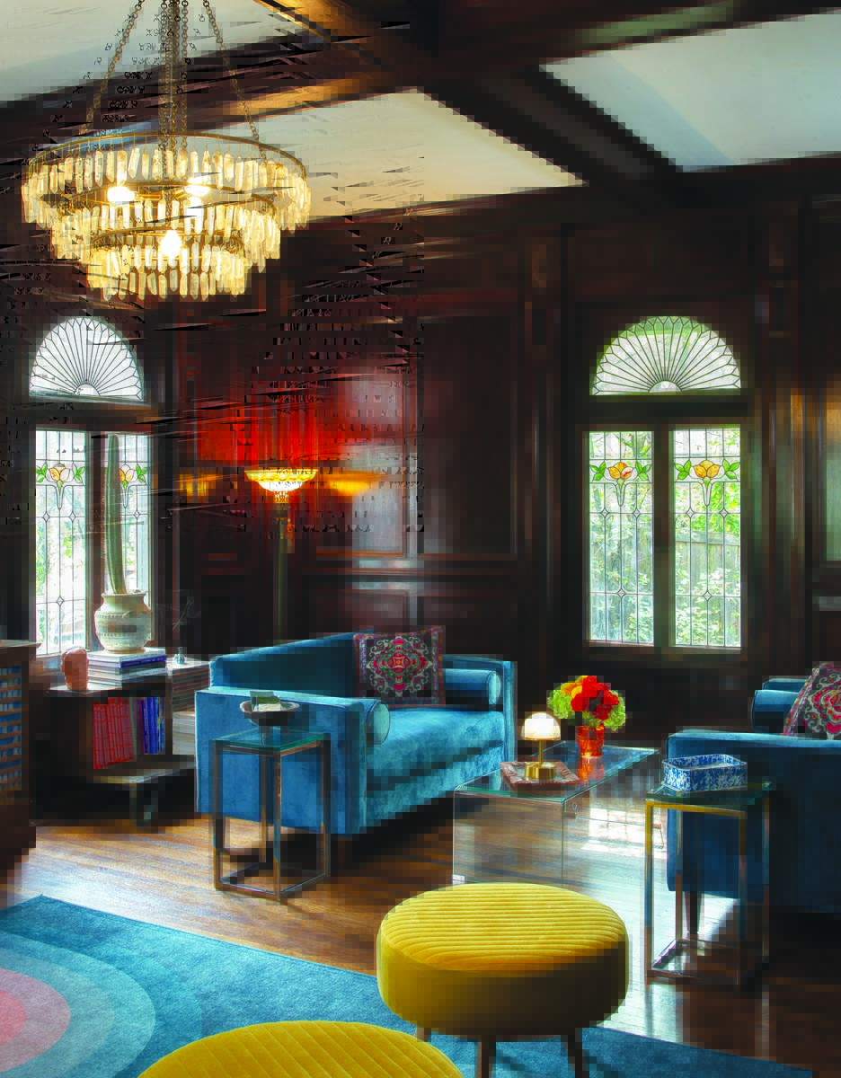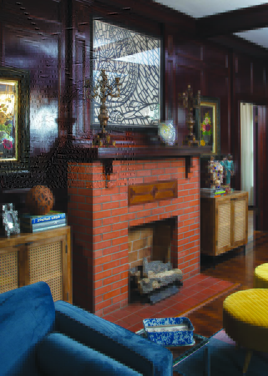 But the couple could see the potential in a house that was solidly built with wood floors and plaster walls. And, like everyone who walks in the front door, they were drawn to the clubby feel of the large living room with its stained oak paneling, coffered ceiling, and original stained and leaded glass windows.