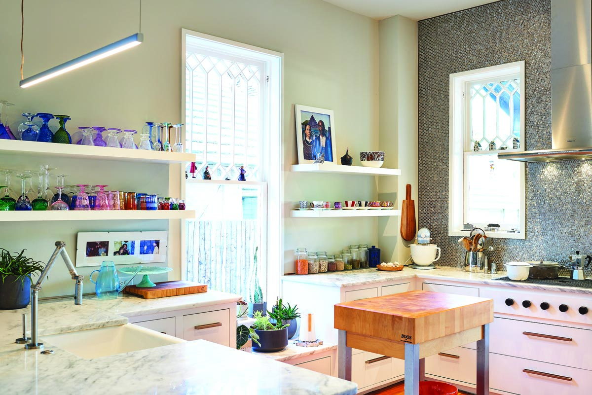 Cabinetry was removed to make the existing kitchen feel even more open. Floating shelves hold Kantor’s glassware, coffee cups and artwork. The framed photograph on the top shelf is by Elizabeth Kleinveld and Epaul Julien. Deep drawers and new pulls create a fresh feel. The articulating deck-mount faucet is from Kohler’s Karbon line.