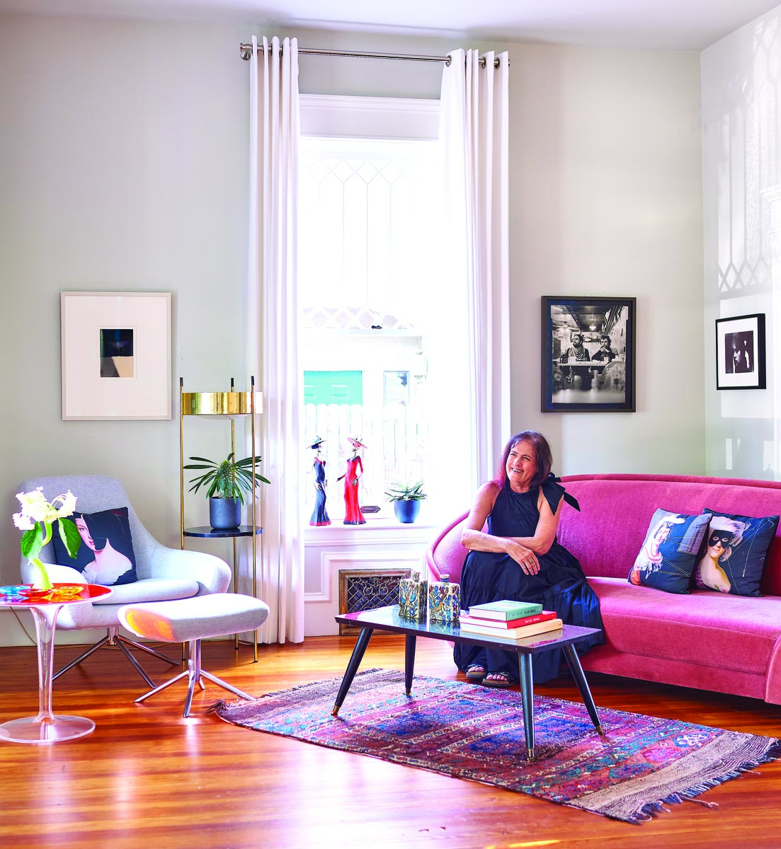 Loli Kantor opted for the perfect shade of gray, Big Chill from Sherwin-Williams, which is used throughout the home. All trim is painted SW Extra White. The Gubi sofa from Denmark is covered in pink mohair; the table is vintage and rug is from Turkey. Custom draperies from Kite’s add privacy and enhance the height of the ceilings. The photograph to the left is by Masao Yamamoto. Hanging on the wall behind the sofa is a photograph by Gabriela Kolčavová of Czech Republic; the smaller portrait is by Alexandra Catiere from Minsk, Belarus. Kantor is an avid collector, and many of the artists also are friends.