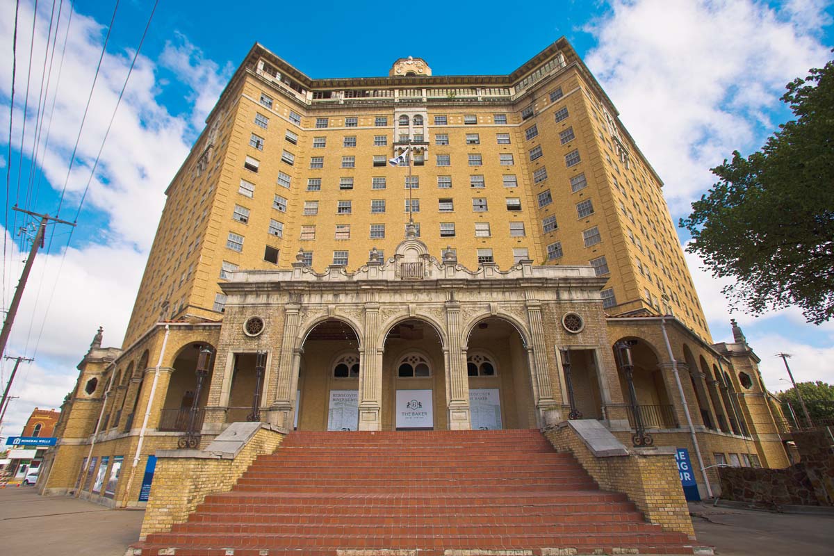 n a blazing hot summer afternoon, the Baker Hotel’s red tile steps swarm with activity. Never mind that the 1929 Mineral Wells landmark hasn’t welcomed guests in almost 50 years; the shuttered downtown hotel’s grounds teem with visitors craning their necks to take in the intricate details of all 14 stories of the brick building. Young and old, the curious walk the wide promenade encircling the lobby level, trying to peer inside the silent behemoth.