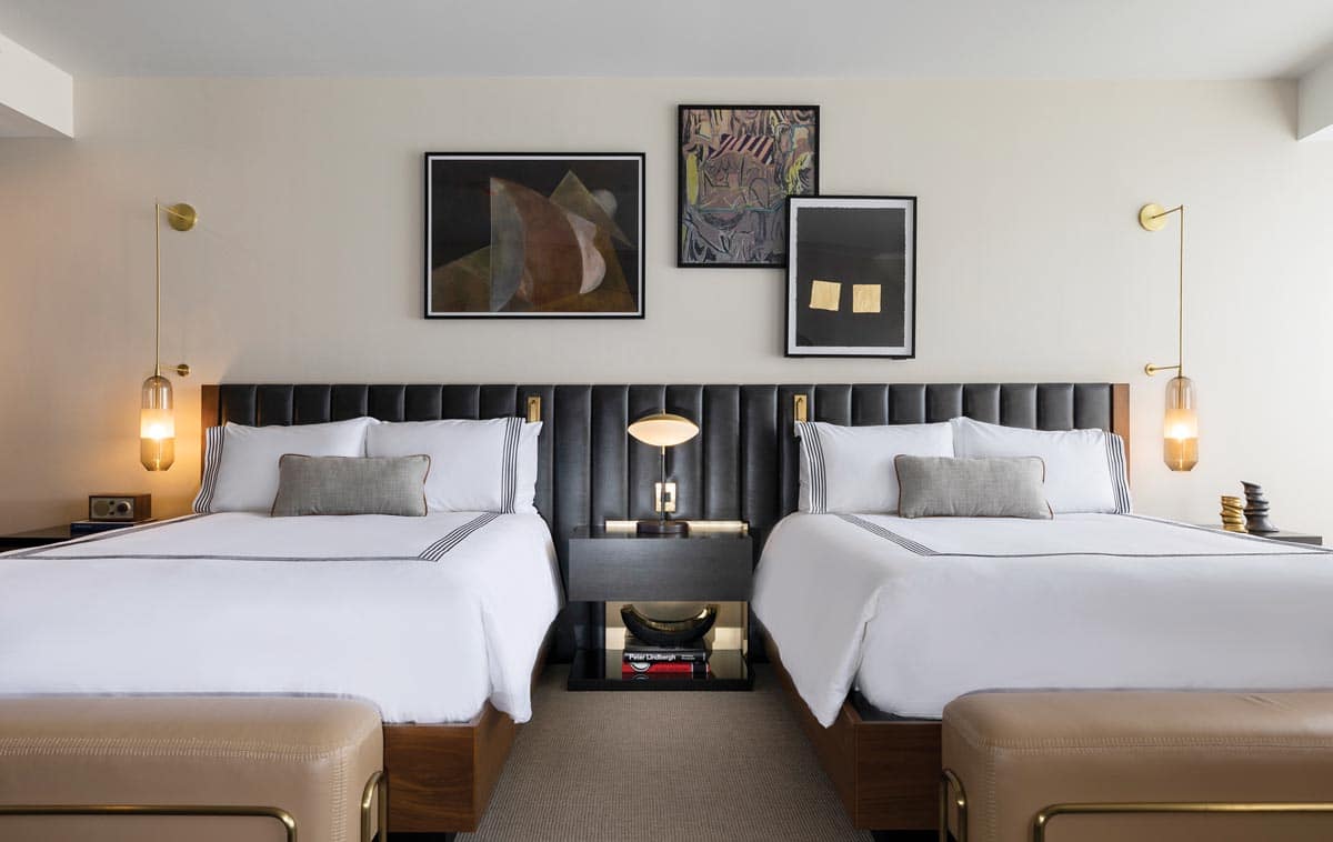 In 219 guest rooms (including 52 suites), find significant midcentury design elements, from bedside lighting and walnut-and-brass headboards and desks to low-slung chairs, coffee tables and sofas. Even more stunning are the Thompson’s two 2,000-square-foot penthouses on the 49th floor, going for $10,000 nightly.