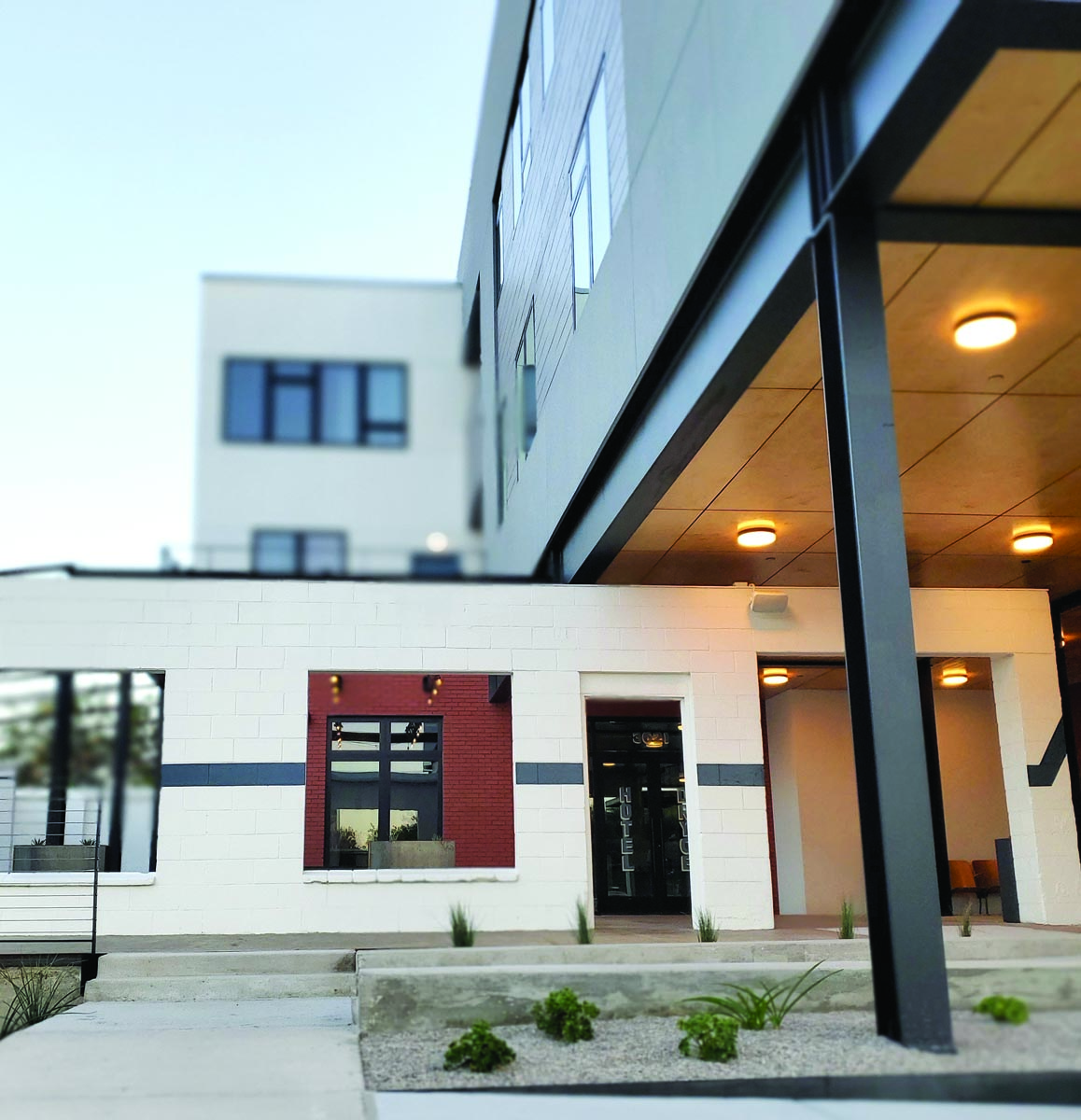 Those who have been to the Dryce say it feels a bit like Marfa, or Austin in the old days: The building is a mix of modern meshed with vintage — the remnants of the dry ice warehouse that once sat in this neighborhood form the outdoor patio. Faded paint on the old concrete floor gives it some character while complementing the earthy color scheme. The landscaping consists of plants that love the heat.