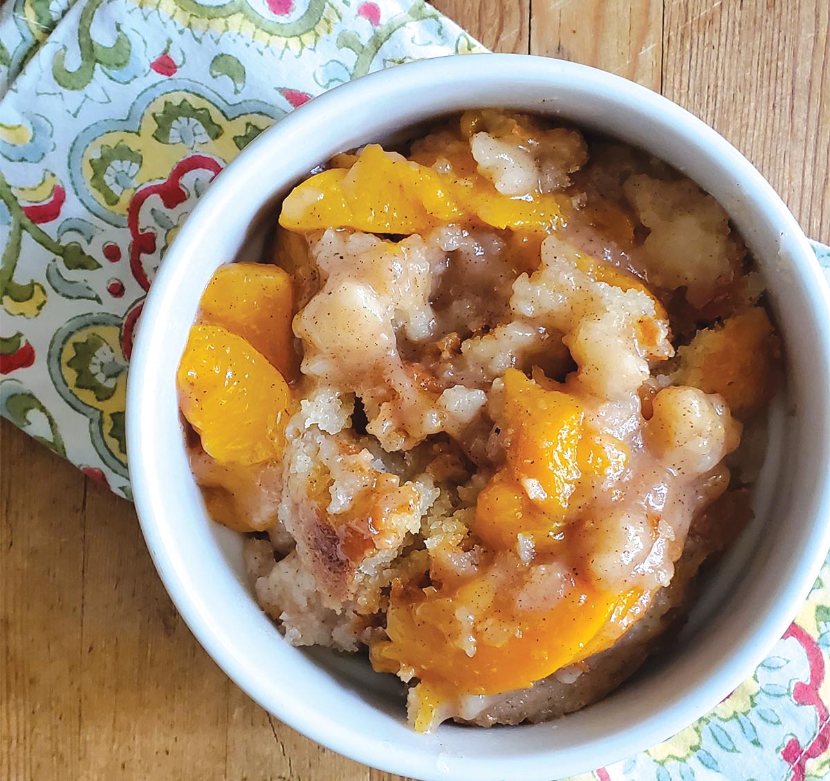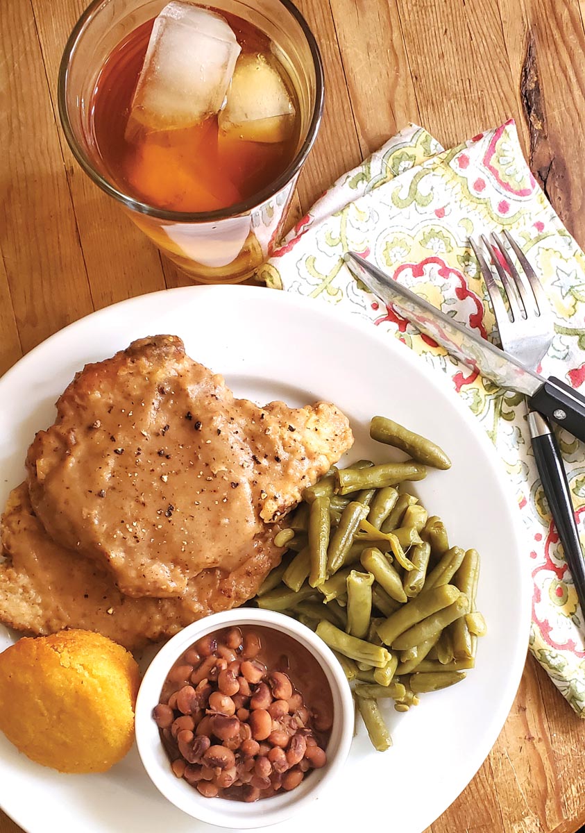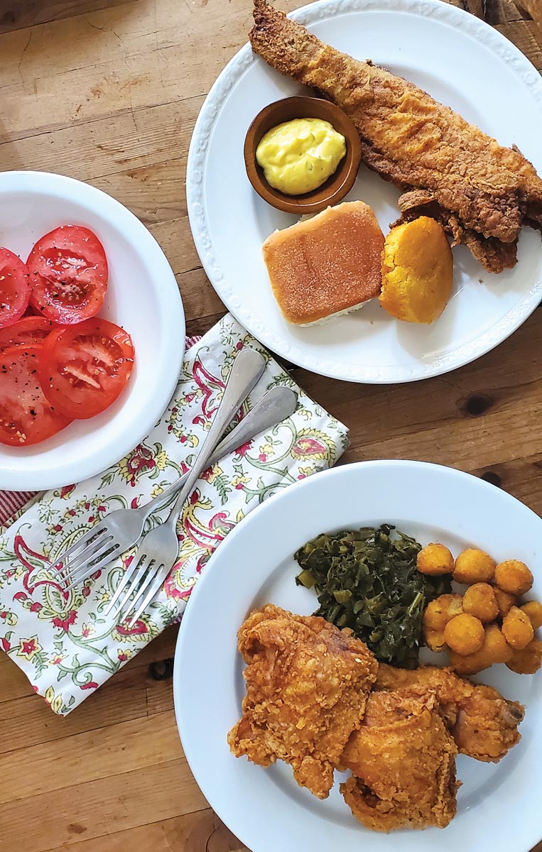 Our takeout feast from Drew’s Place includes smothered pork chops (not always available), fried chicken, spicy whole catfish, sides of green beans, black-eyed peas, fried okra and collard greens, plus rolls. And, of course, peach cobbler.