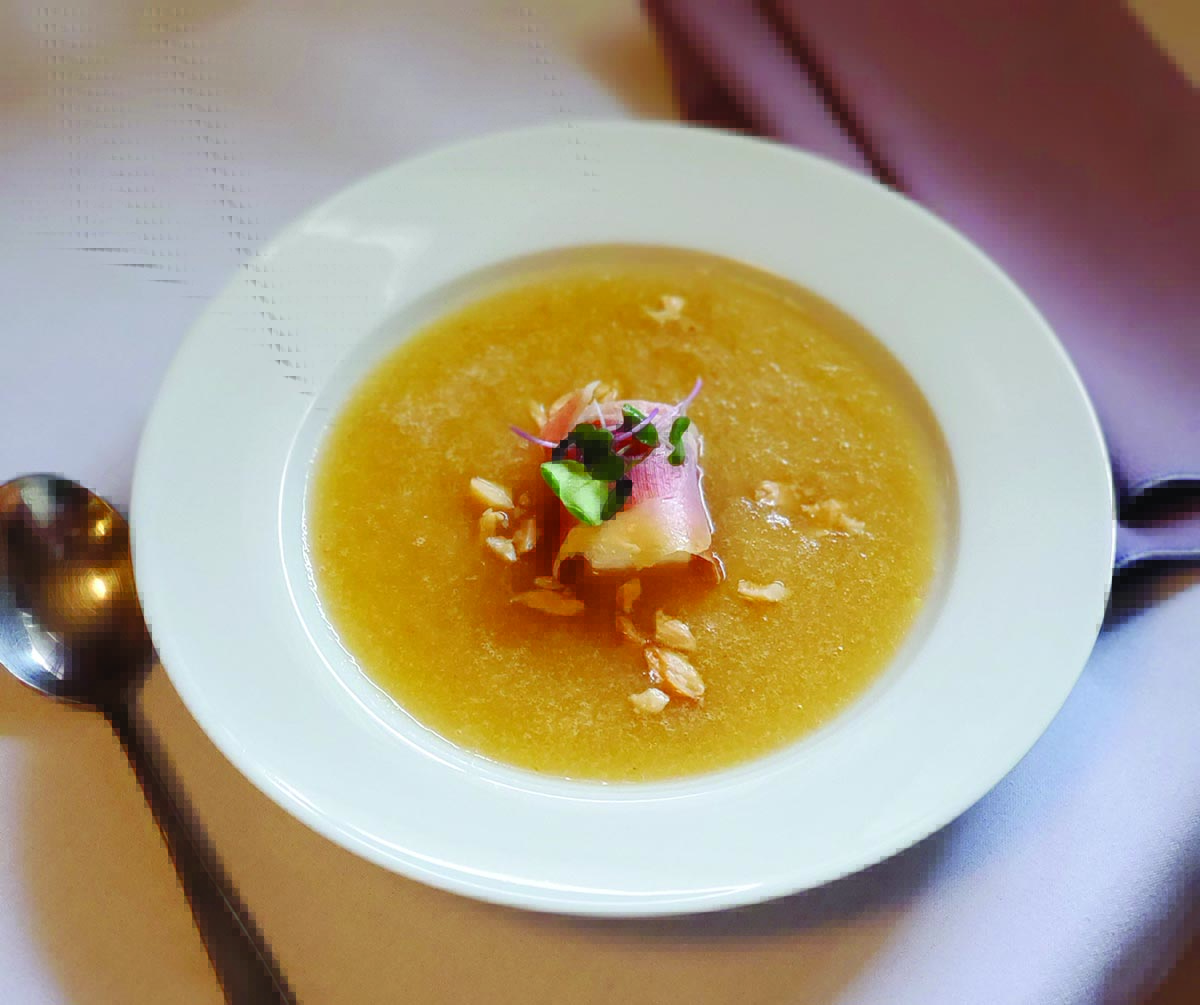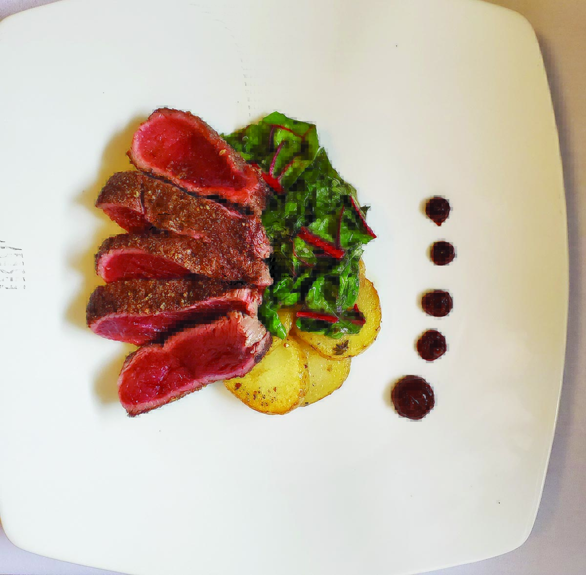 She likes seasonal chilled soups and prefers wild game, everything from elk to antelope, over beef. Her sides are simple but inspired, as are her desserts, which always include a meat and cheese plate for those who prefer a continental end to the evening’s meal. Housemade condiments, such as a sour cherry mustard, are subtle additions packed with flavor. Her eggplant caponata is light, and golden raisins add just the right touch of sweetness.