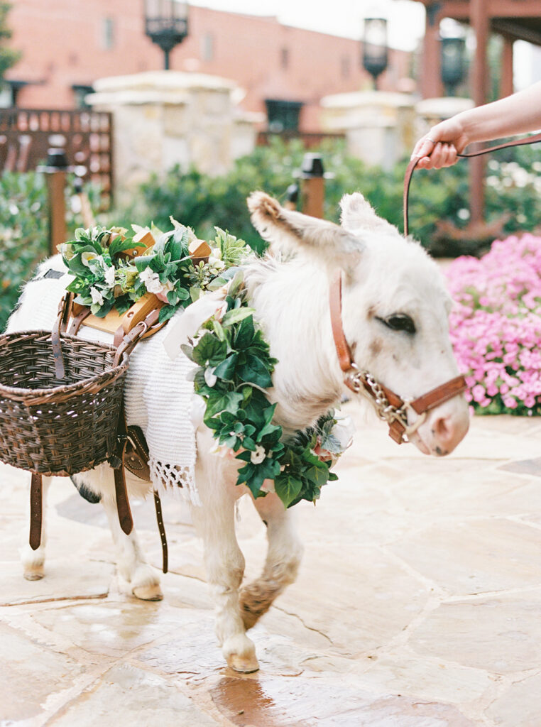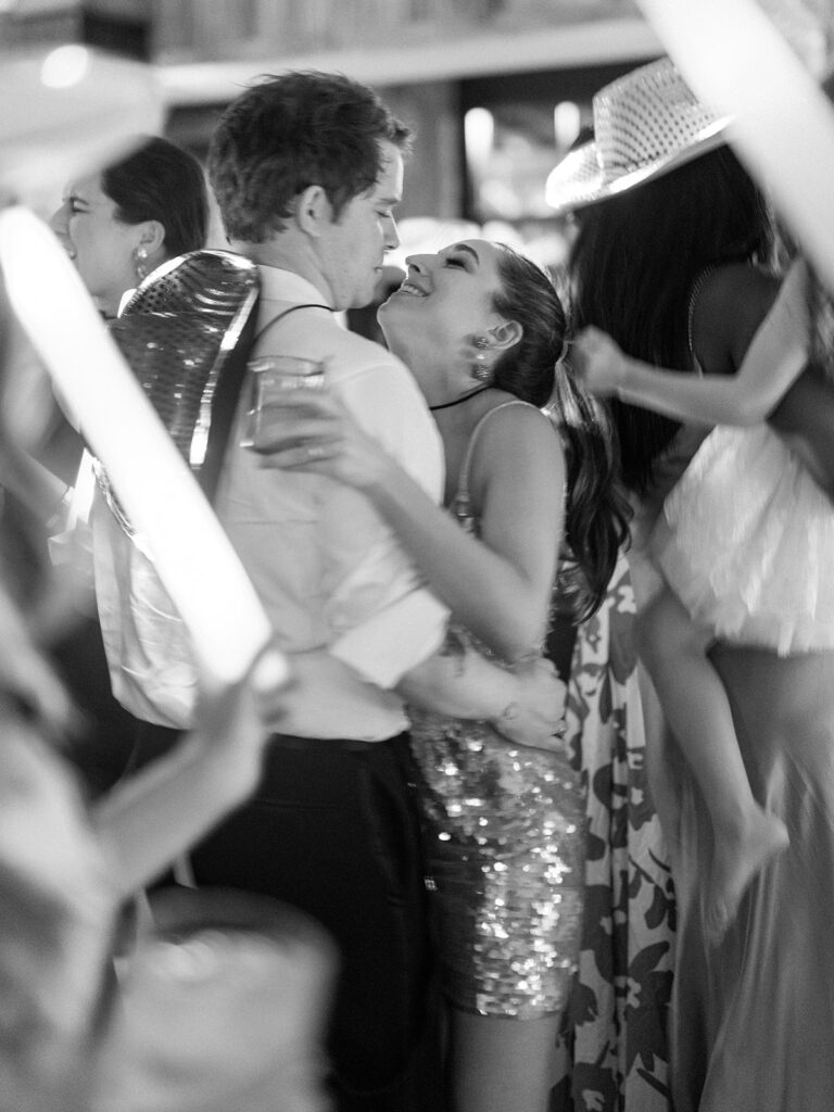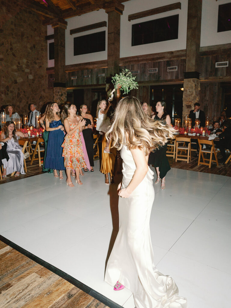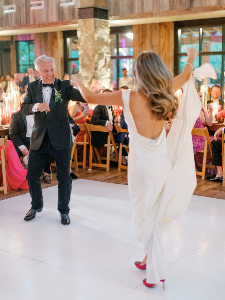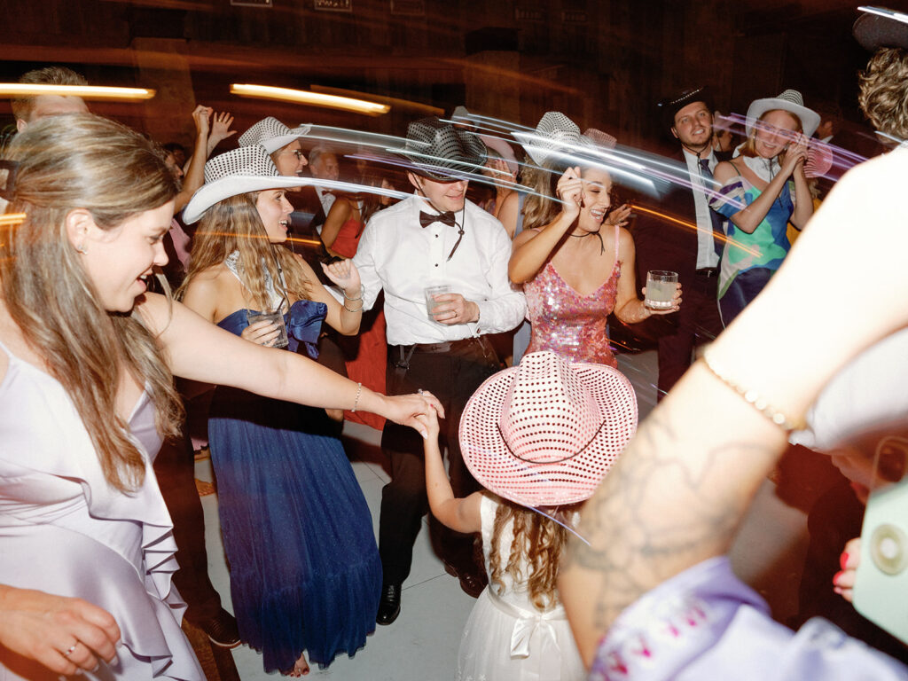 We were lucky to have the weather clear up for cocktail hour, so we got to be outside for a little while where guests enjoyed drinks and donkeys! Making sure we allotted as much party time as possible was a huge part of the planning process for us so getting everyone fed and getting to all the reception-related customs right off the bat was our approach. Once everyone was seated Chase and I danced to “Strangers in the Night” by Frank Sinatra followed by my dad and I dancing to a medley of James Taylor’s “You’ve Got a Friend” and Boston’s “Foreplay/Longtime”. Chase and his mom danced to “Forever Young” by Bob Dylan. After that, we knocked out the bouquet toss and the garter toss (which is an underrated, neglected wedding tradition in my opinion). My dad, a former pilot, gave a lovely speech comparing marriage to flying an airplane and there was not a dry eye in the house. Once dancing began, I changed into a sparkly pink vintage dress from Happy Isles Salon along with a pair of silver flip flops – I had to take it easy on my feet at that point. Seeing everyone with their illuminated cowboy hats and light-up foam sticks really made it feel like a party that could go all night. The night wrapped up with Chase and me singing and dancing on stage. My dad joined us for “Eight Days A Week” by The Beatles (there seems to be a theme here…). Our encore was “All Night Long” by Lionel Richie which was an apt choice considering we never wanted the night to end.