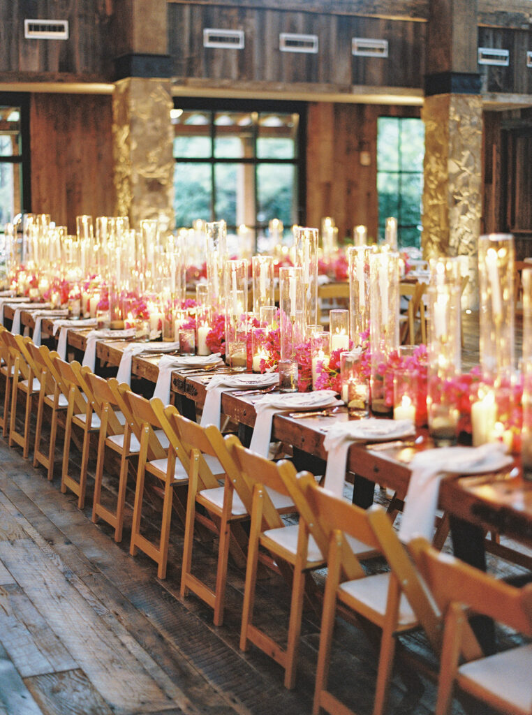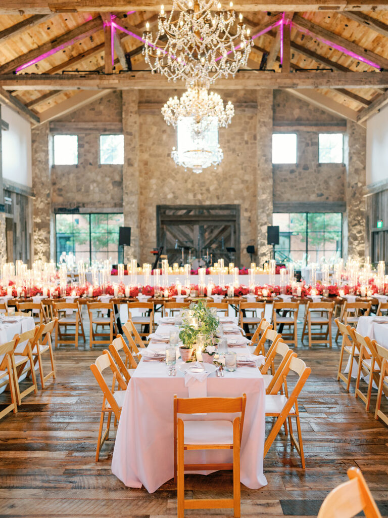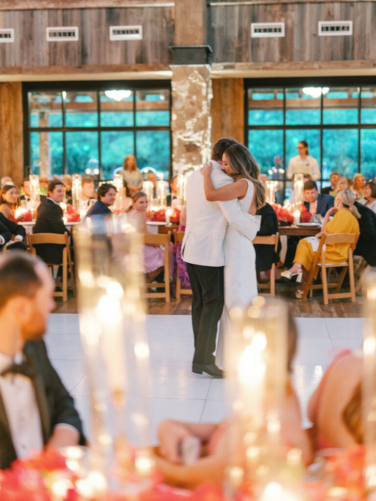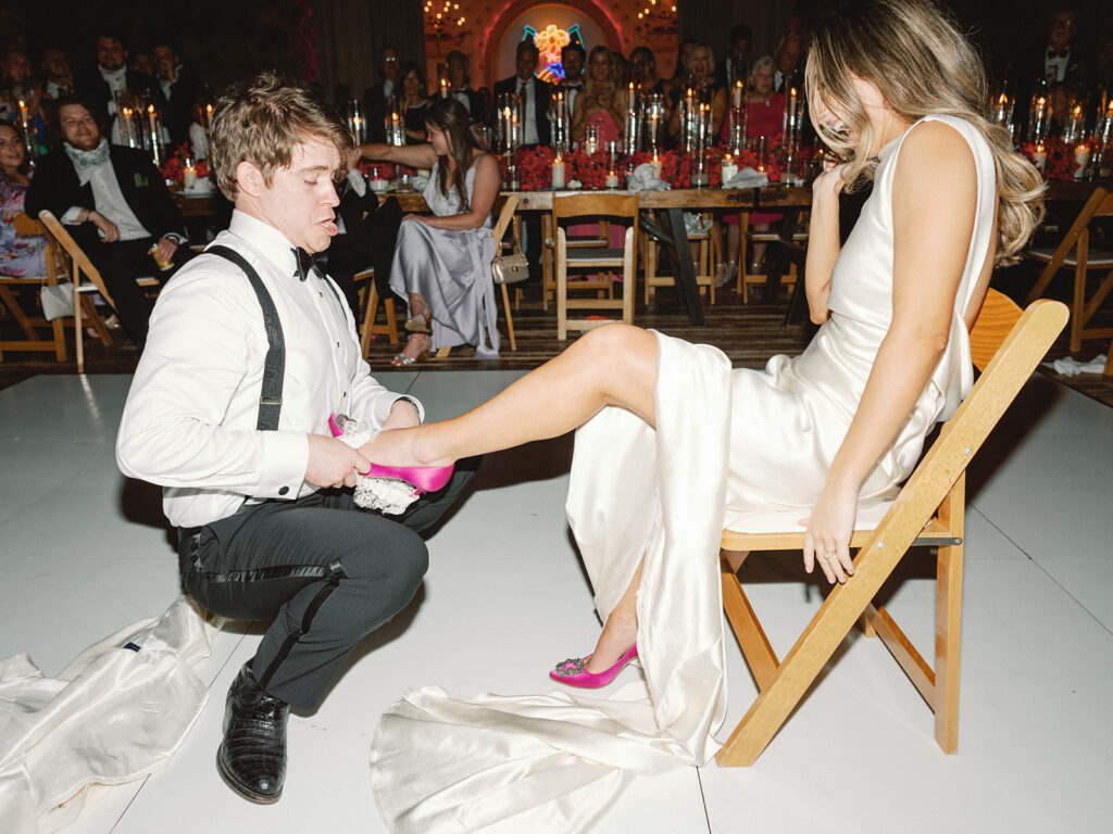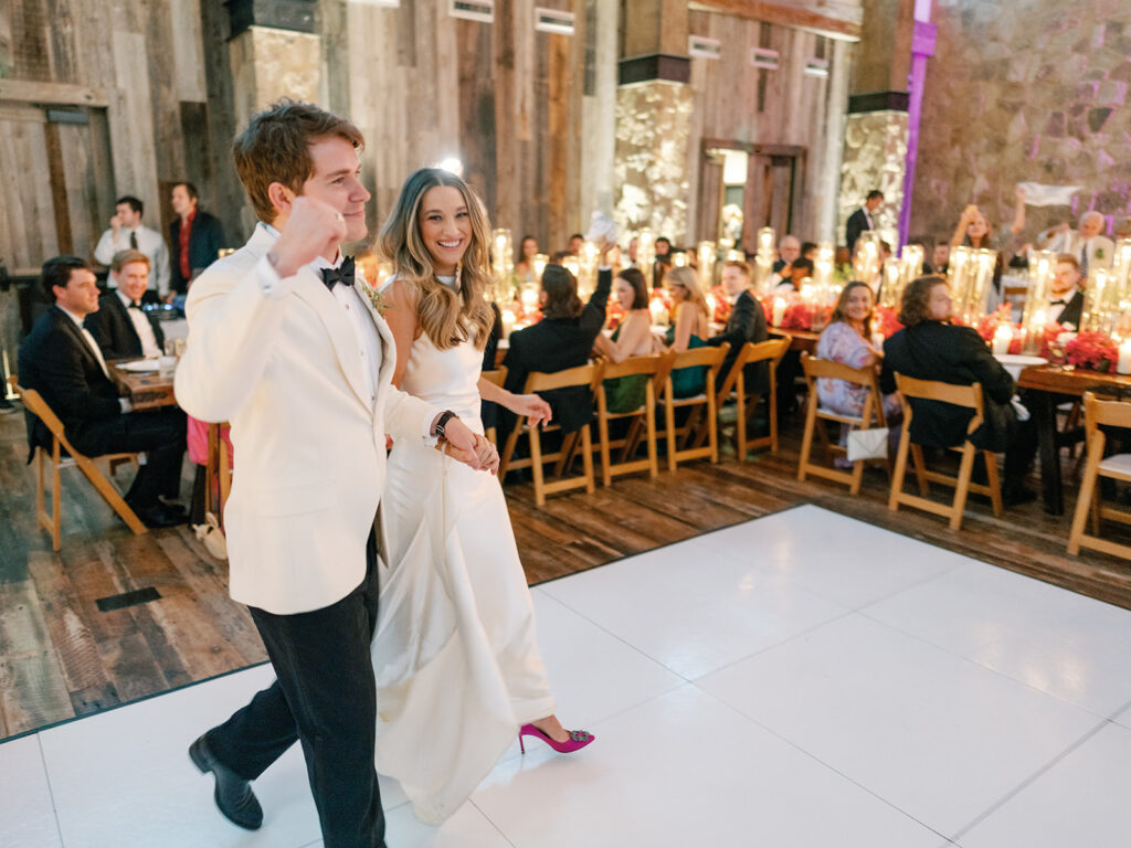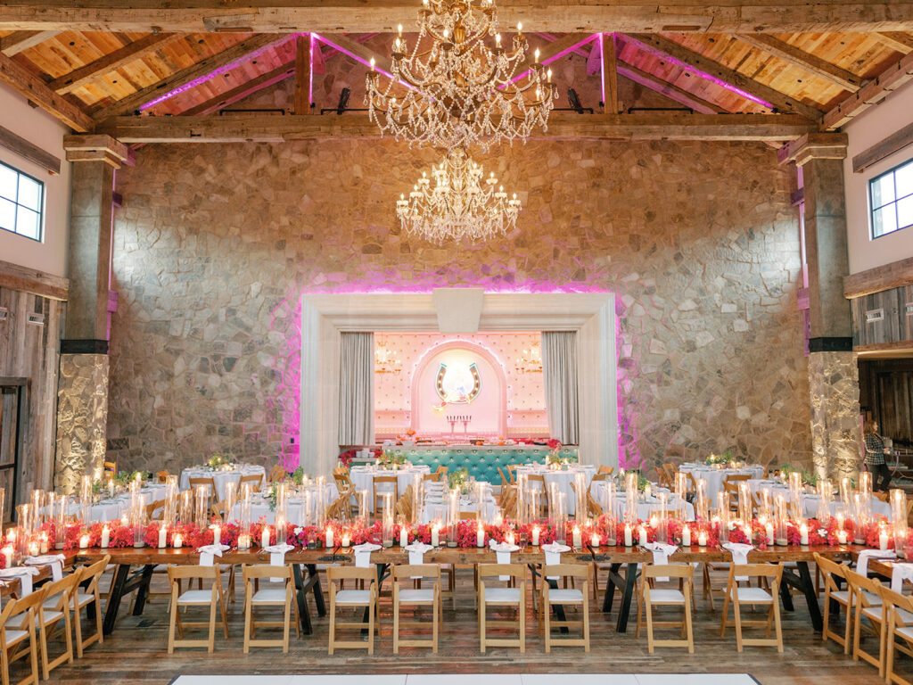 We were lucky to have the weather clear up for cocktail hour, so we got to be outside for a little while where guests enjoyed drinks and donkeys! Making sure we allotted as much party time as possible was a huge part of the planning process for us so getting everyone fed and getting to all the reception-related customs right off the bat was our approach. Once everyone was seated Chase and I danced to “Strangers in the Night” by Frank Sinatra followed by my dad and I dancing to a medley of James Taylor’s “You’ve Got a Friend” and Boston’s “Foreplay/Longtime”. Chase and his mom danced to “Forever Young” by Bob Dylan. After that, we knocked out the bouquet toss and the garter toss (which is an underrated, neglected wedding tradition in my opinion). My dad, a former pilot, gave a lovely speech comparing marriage to flying an airplane and there was not a dry eye in the house. Once dancing began, I changed into a sparkly pink vintage dress from Happy Isles Salon along with a pair of silver flip flops – I had to take it easy on my feet at that point. Seeing everyone with their illuminated cowboy hats and light-up foam sticks really made it feel like a party that could go all night. The night wrapped up with Chase and me singing and dancing on stage. My dad joined us for “Eight Days A Week” by The Beatles (there seems to be a theme here…). Our encore was “All Night Long” by Lionel Richie which was an apt choice considering we never wanted the night to end.
