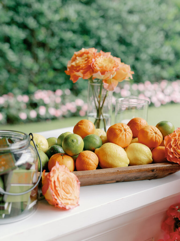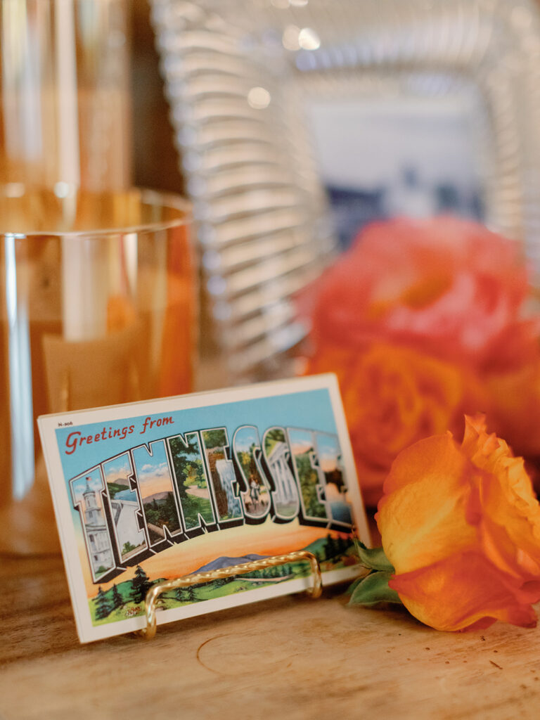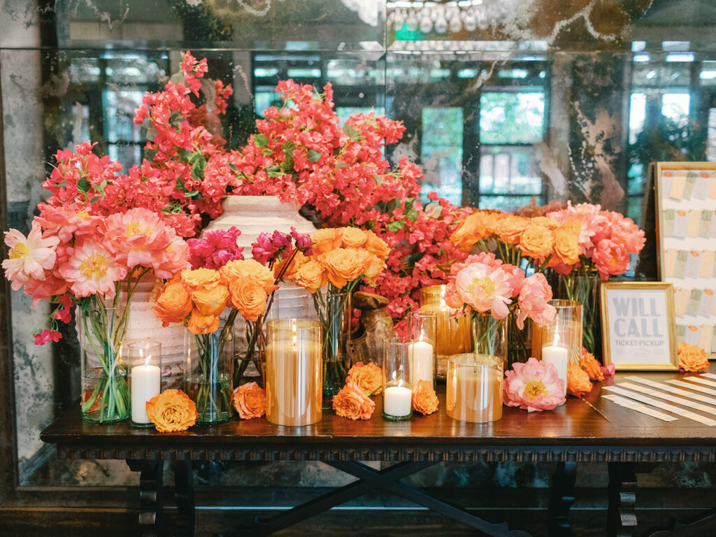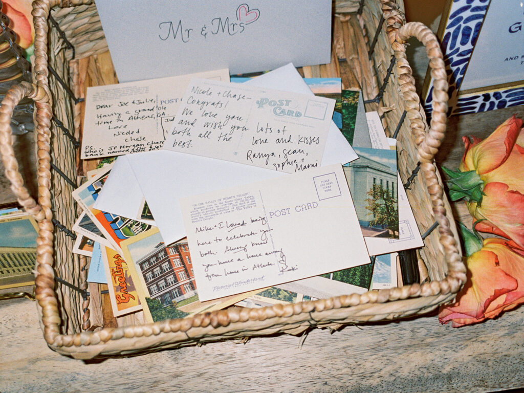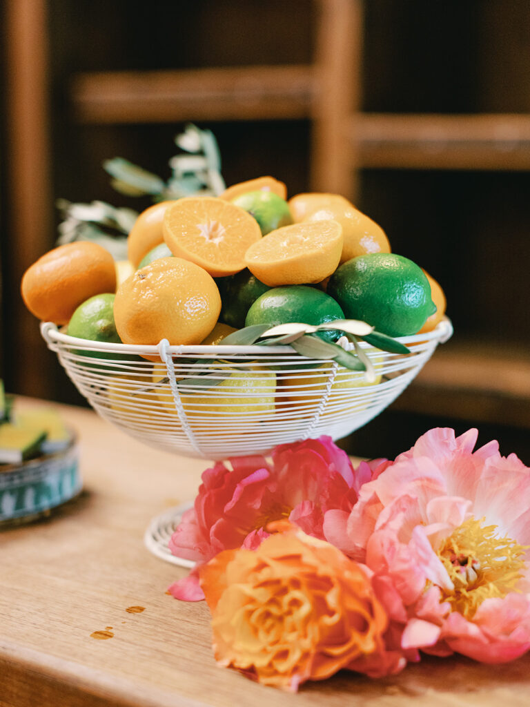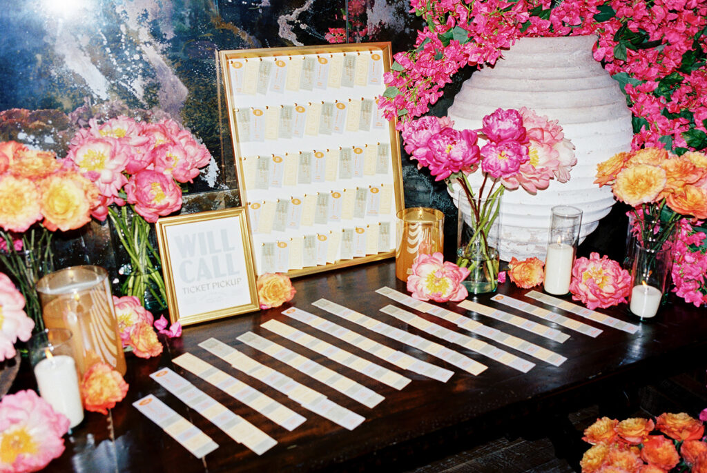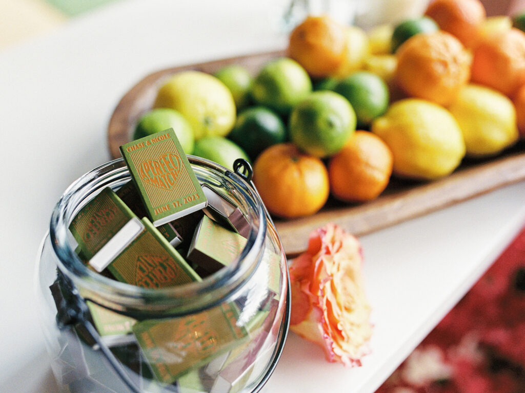 We told our planner, Rachel [Honey & Co. Weddings], from the beginning that we wanted this to almost feel like a party we could’ve thrown in our backyard. The feeling we wanted to share was you could find all the details somewhere in our home whether that be bowls filled with limes at the bar or framed photos of our loved ones or potted herbs or Italian and Greek-inspired serving dishes. We also wanted our guests to be able to feel like they saw pieces of Chase and myself throughout the night like having concert ticket stubs as our guests’ table assignments as an ode to Chase’s love for music and having my favorite flowers, bougainvilleas, throughout the reception. Also having our guest book be an assortment of vintage postcards was a way for Chase and I to reminisce back on the days when we were long-distance we would send postcards to each other. Basically, we wanted our wedding to be a peek into our relationship and what we love.