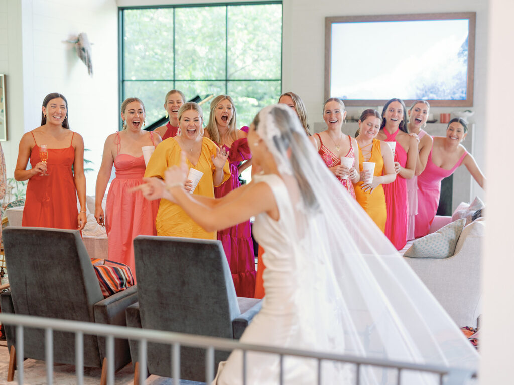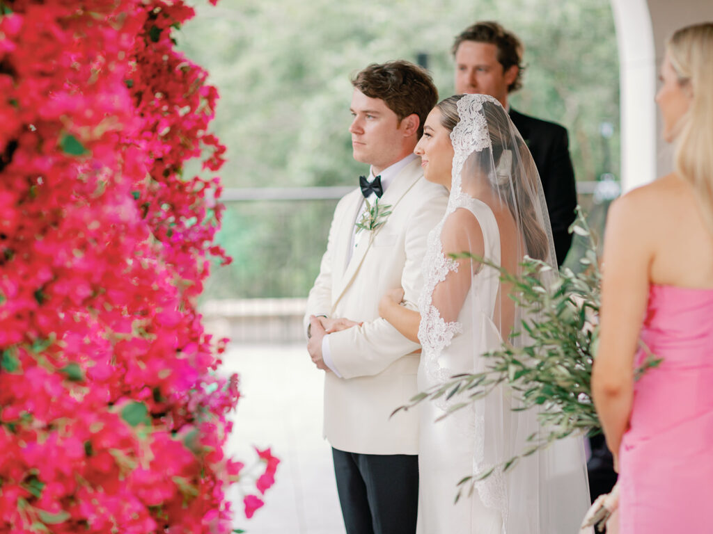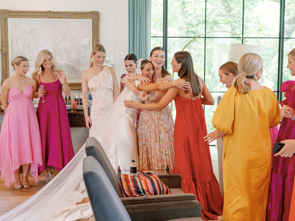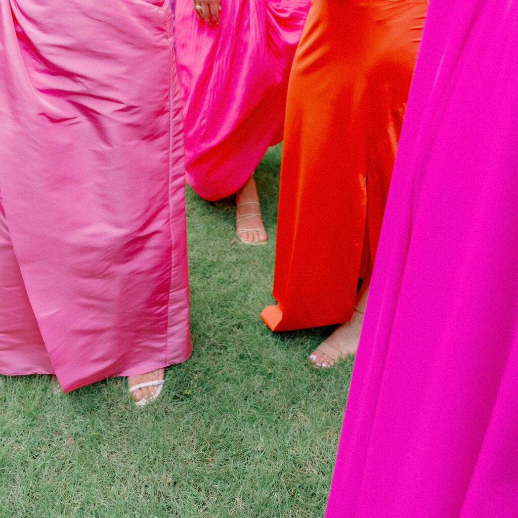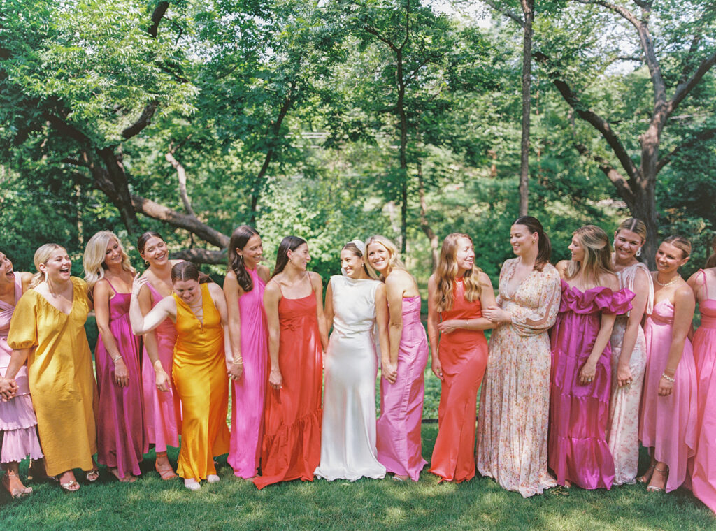 With as many bridesmaids as I had, I wanted to make their lives and mine as easy as possible. I told them they could wear whatever color they pleased, but if they wanted a bit of guidance they could wear any shade of a bougainvillea. Luckily, bougainvilleas come in many colors so seeing what everyone picked and how the variety of colors turned out was such a fun surprise for me! Everyone standing together looked so fabulous!