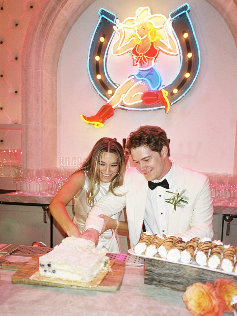 Chase and I really wanted a specific kind of Italian wedding cake, but it was hard to find someone local who would do it. Truth be told, Chase and I didn’t care much about the cake. We cared more about there being cannolis (which were from Swiss Pastry Shop and were delicious!) so we flew our cake in from Oasis Cafe. While I’m sure the cake was fresh in their store in Queens, New York, I will say, by the time the cake got to the venue it was kind of the most pitiful cake you’ve ever seen. Chase and I laughed as soon as we saw it. It wasn’t the 7 tier cake you see these days, but the memory we made with our sad little cake is something we look back fondly on.