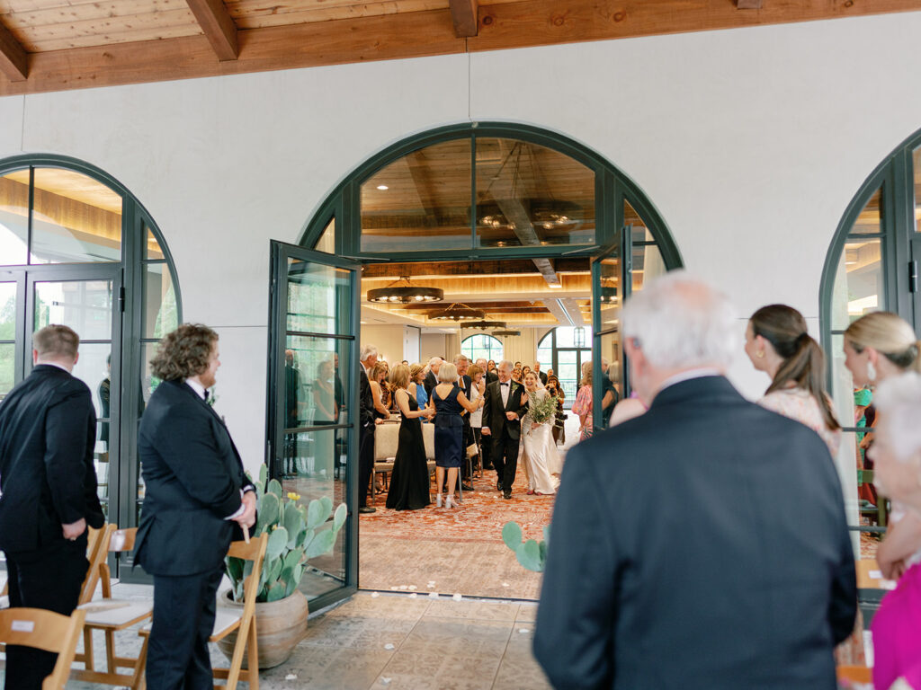 Our ceremony had to make a last-minute pivot from being held on the lawn outside to a covered porch upstairs in Hotel Drover due to rain. Rachel made sure this change happened seamlessly and I didn’t have to do much thinking, so, a big thank you to Rachel. We were also extremely lucky to have Chase’s groomsmen Adam and Conor provide music for our ceremony as they are two extremely talented guitar players. My dad and I walked down the aisle to “I Will” by The Beatles. And the man to marry us was my brother-in-law, Jonny, whom Chase and I are extremely close with. He is an amazing storyteller and husband so having him perform our ceremony was one of the best decisions we made when it came to our wedding. We had our mothers accompany us with the Unity Candle lighting which is a Catholic tradition we wanted to incorporate into our ceremony. After we sealed our union with a kiss, Chase and I walked down the aisle as a married couple to “Till There Was You” also by The Beatles.
