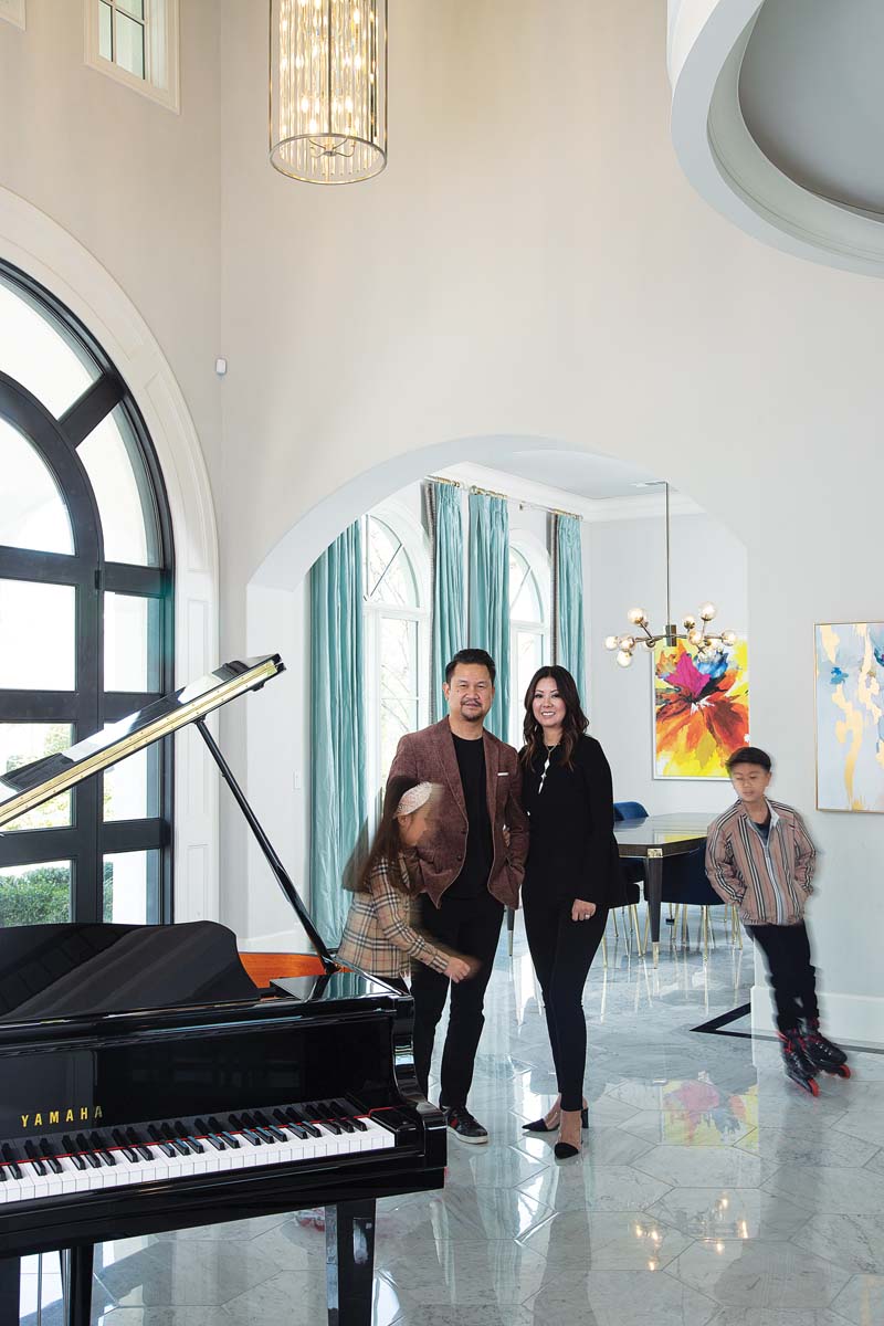 From the first step into the foyer, a feeling of lighthearted glamour swirls around Vivian Yolpak’s Westlake home. Light bounces off the gleaming marble floors and floats up the sinuous front staircase. A black baby grand poses under the balustrade, its graceful legs echoing the lean lines of the chandeliers that dangle above.