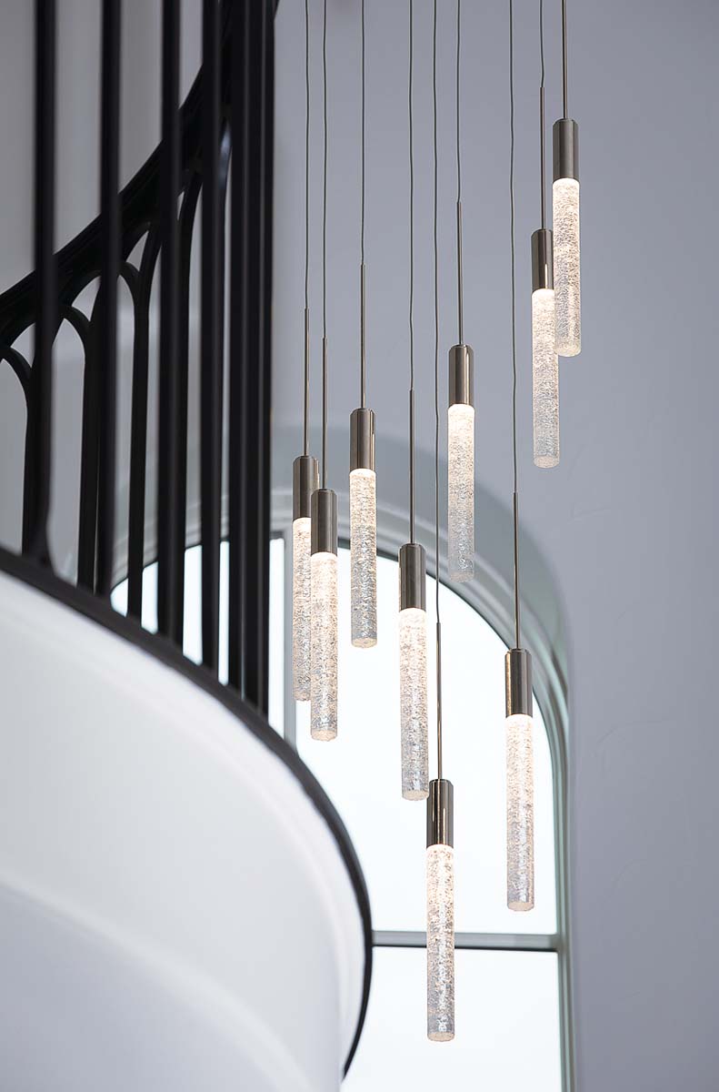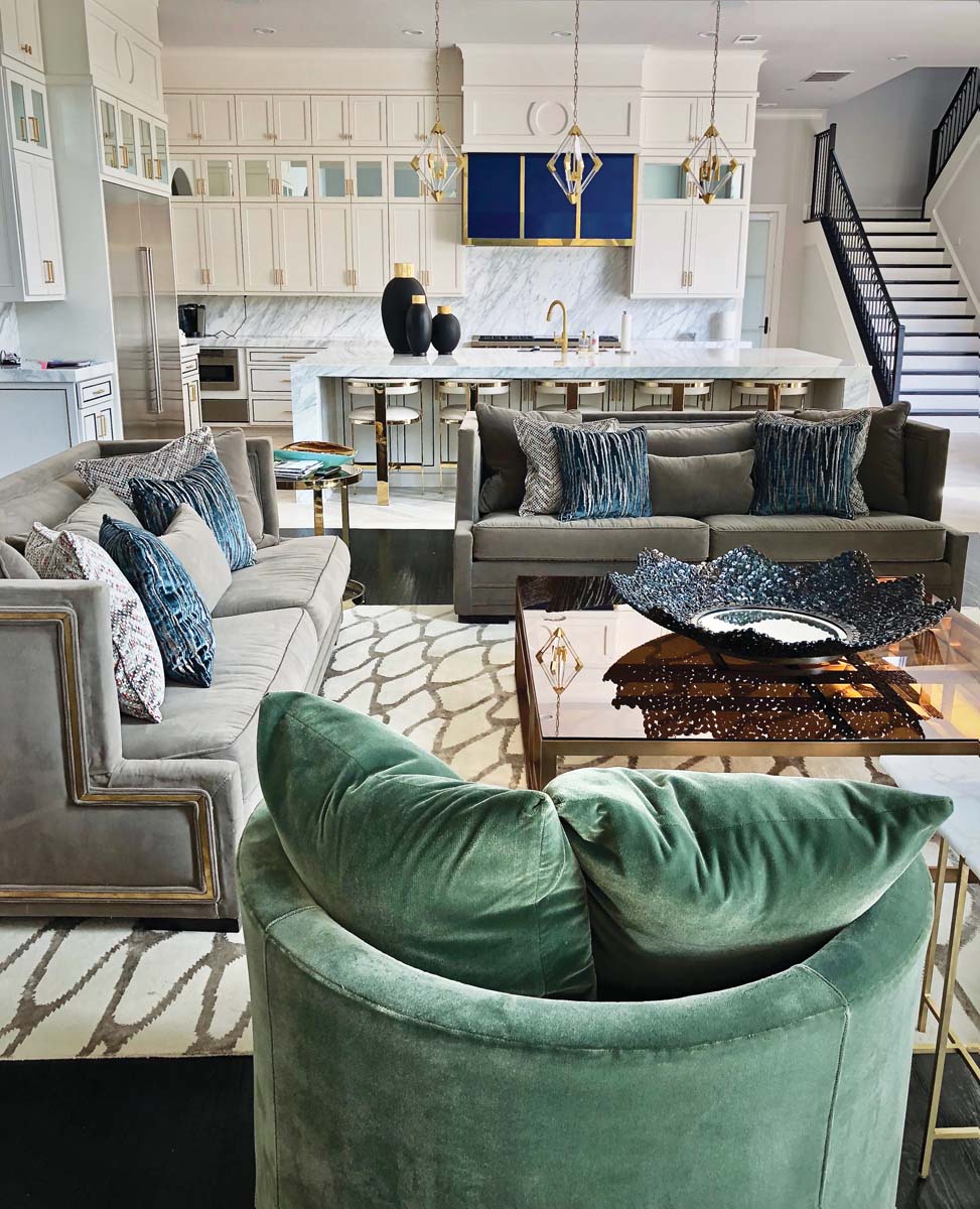 She succeeded. The home’s modern traditional style balances sophistication with energy, graceful refinement and a splash of playfulness. “This feels almost like an upscale high-rise to me, but then it’s warm and cozy because it’s kind of brought down,” says Burkhart. “We stayed with updated fixtures that will stand the test of time, surfaces that you could use, and be on, and flop on, and all that kind of stuff — but then whenever you have no toys around, it still looks clean and fresh.”