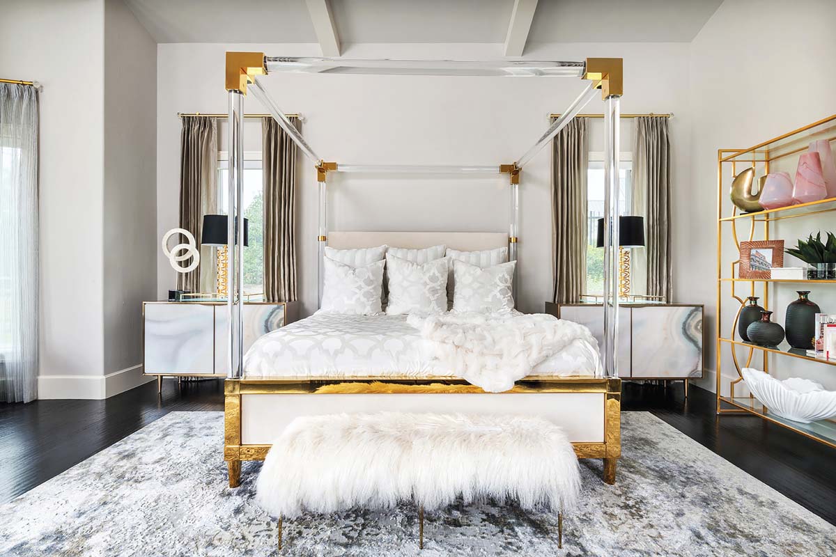 Shimmering views of the pool also extend from the master bedroom, a soothing retreat with fuzzy white textiles and hushed neutrals. An assortment of metals continues the jewelry-box vibe, including a burnished bronze chandelier, gold bookshelf and silvery Lucite bed frame. “Metal mixing is good,”