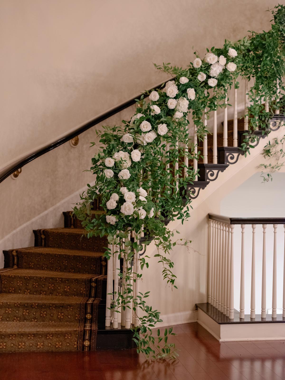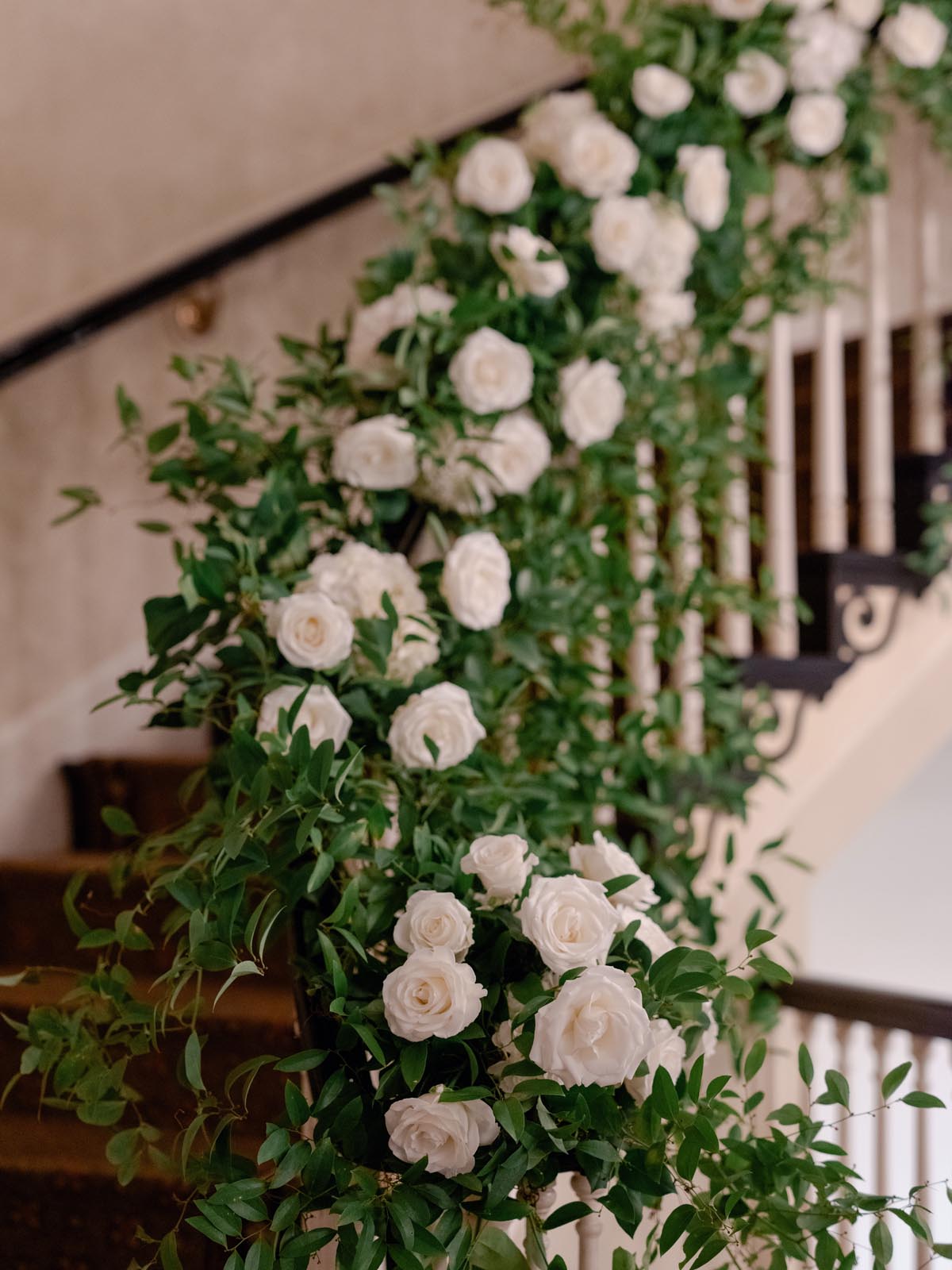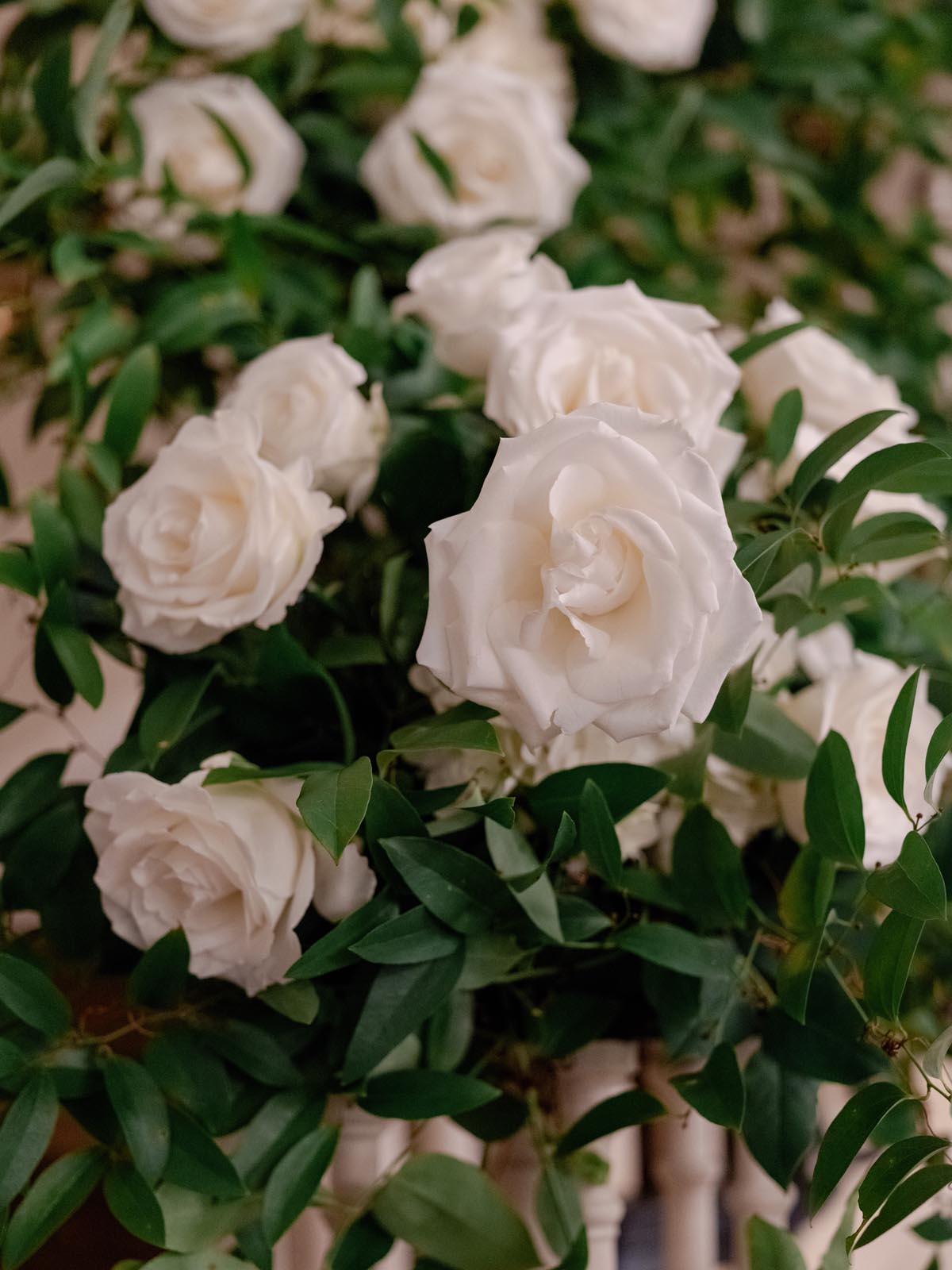 The florals color palette consisted of white flowers with a tad of blush and a little greenery. They consisted of white-cream Playa Blanca roses, white hydrangeas, white ranunculus, Tibet roses, white majolica roses, variegated ivy, ruscus, salal tips and southern smilax. I selected white flowers because they symbolize purity, love and new beginnings.