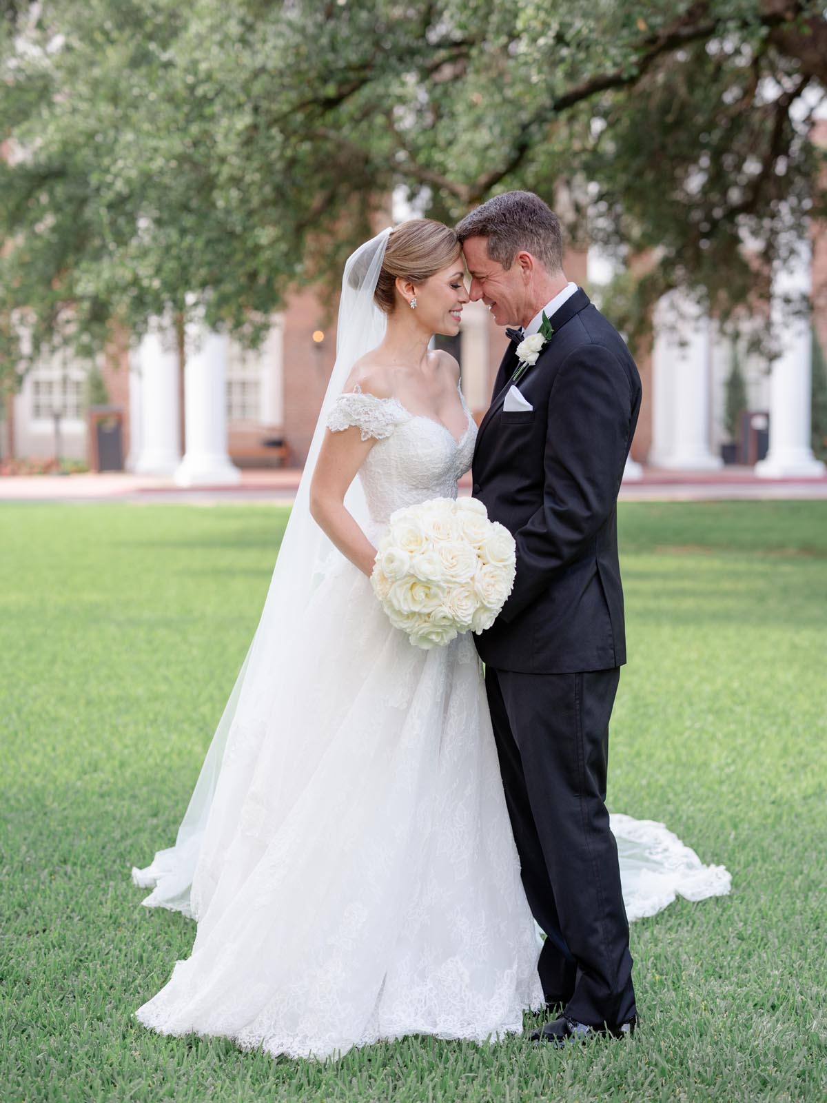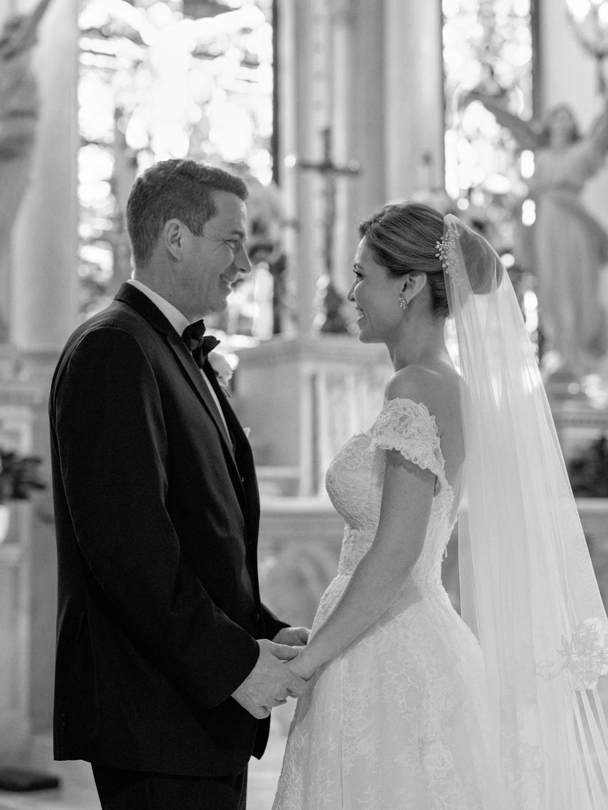 Stunning in a Monique Lhuillier lace dress inspired by timeless icons, Lesley Suarez tenderly held her late grandmother’s rosary in her hands during their Catholic wedding at St. Patrick Cathedral. After joyfully being pronounced husband and wife, the reception at Colonial Country Club followed, where the ballroom was adorned with classic white florals and floating candles, a lively band and a signature bar named after their beloved dog, Ribeye. Their first dance as newlyweds to Frank Sinatra’s “The Way You Look Tonight” and a joint parent dance to The Temptations’ “My Girl” added personal touches to their unforgettable celebration. Join us for an exclusive Q&A with the bride as we dive into the details of their special day.