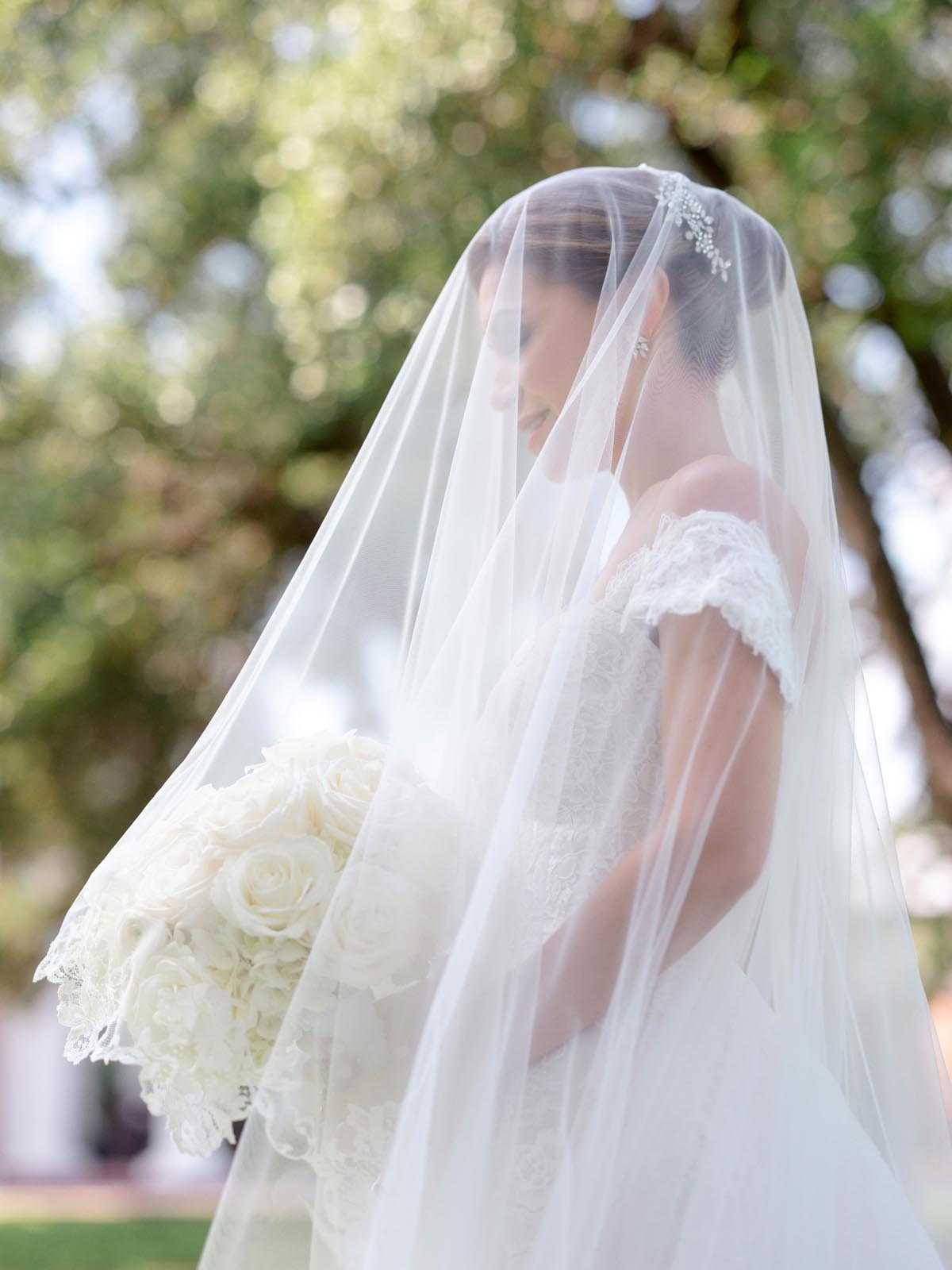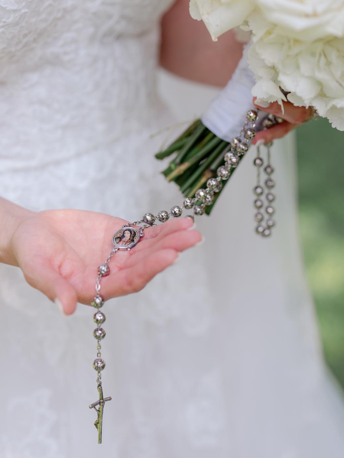 I was thrilled to use my grandma’s rosary for our Catholic mass. She passed away unexpectedly five months before the wedding. I was heartbroken she wasn’t going to be there with me and see me in my dress. So I borrowed her rosary and held it in my hand. I felt a great sense of peace knowing she was there guiding me and blessing our marriage. The cathedral veil was made by Italian designer Monvieve. It was constructed entirely by hand and imported from Italy. It paired up perfectly with the Chantilly dress! The hair comb and earrings were custom-made from Paris by Debra Moreland. I also added a blue Narwhale pin to my bouquet. They are the unicorns of the sea and have been associated with good luck!