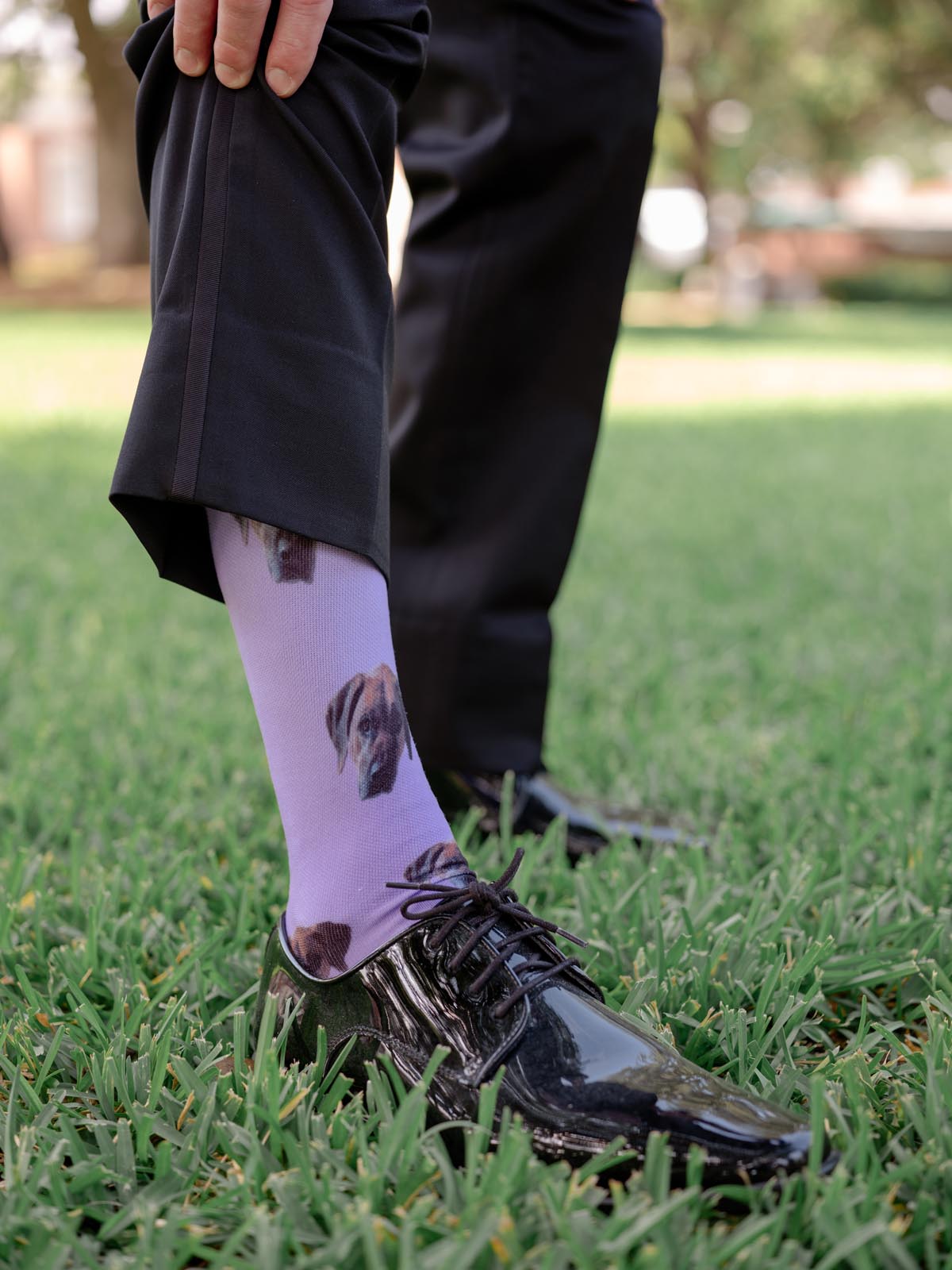 We only had one best man and he wore a black Vera Wang tuxedo. The groom also wore a black Vera Wang tuxedo with a white flower boutonniere and matched it with custom TCU purple socks with our dog’s face on them! The socks were the first gift I had given Dusty when we started dating. It was such a surprise; he kept them and wore them years later to our wedding! We love our dog and wanted to include him as much as possible.