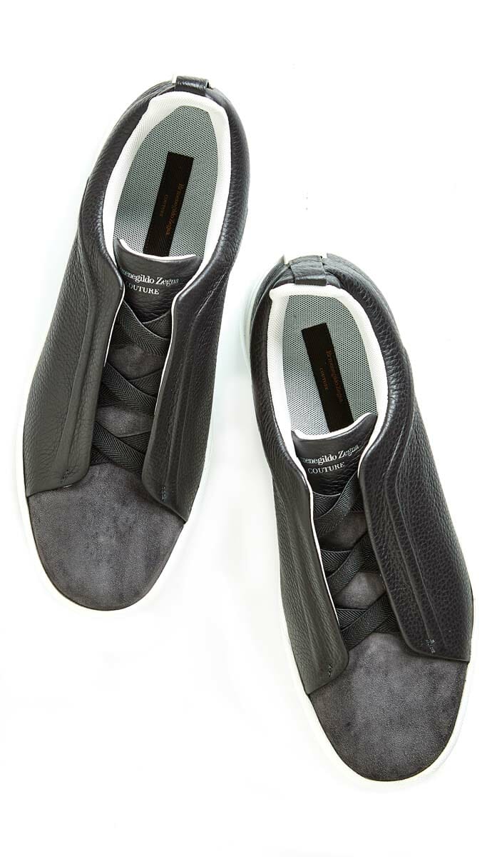 Ermenegildo Zegna’s charcoal grained leather and suede sneakers complement everything from jeans to a tailored suit. $650, Neiman Marcus.