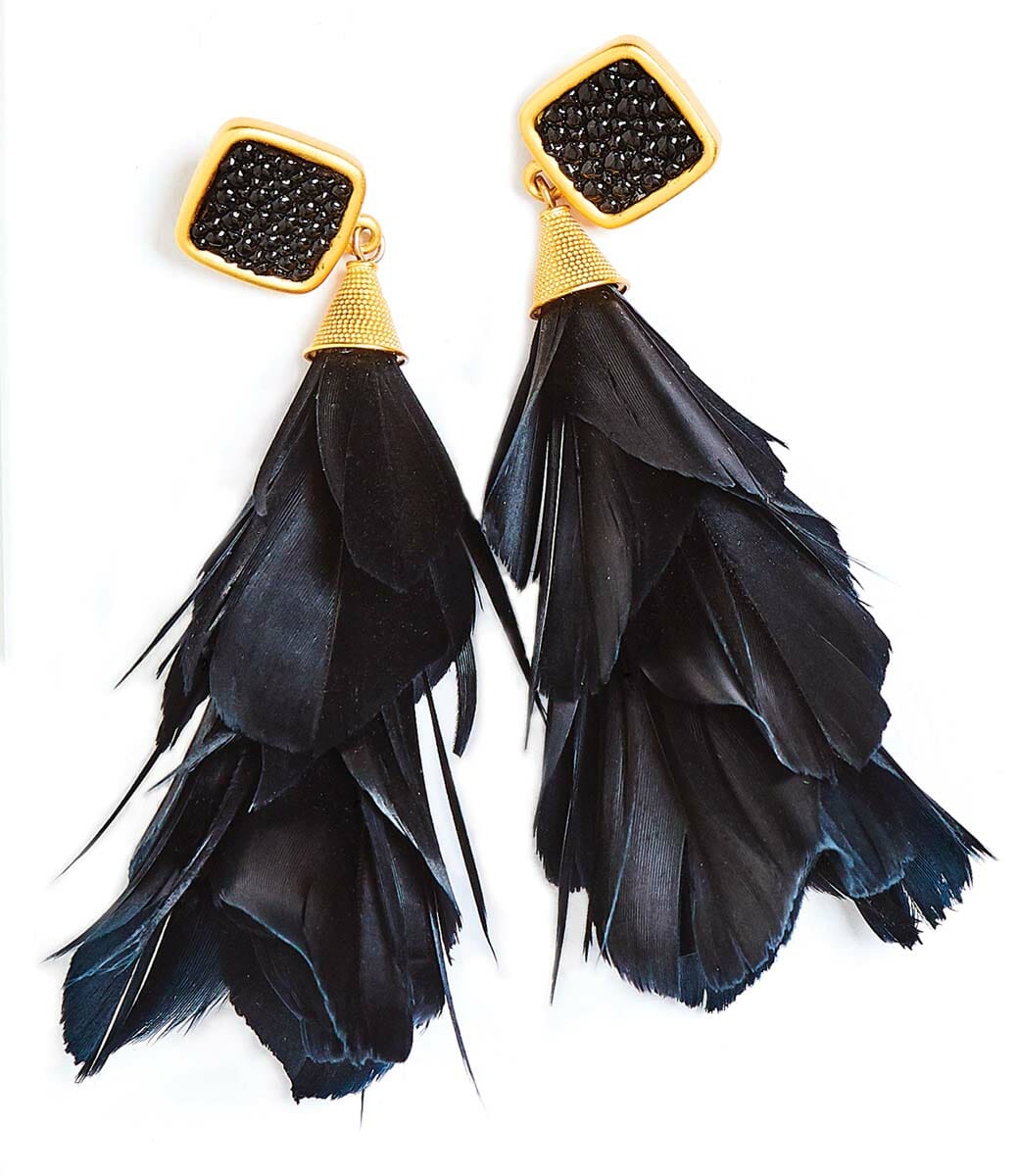 Brackish earrings (from the makers of the popular bow ties) are handcrafted in Charleston, South Carolina. The Parades design features black goose feathers with stingray accents. They come in a branded pine box with suede jewelry bag. $165, P.S. The Letter.