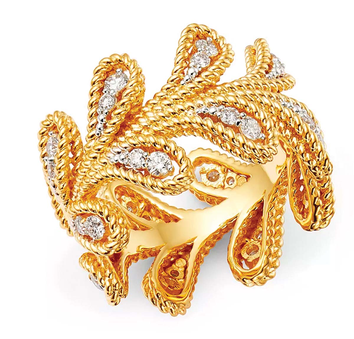 Diamonds twinkle in an ornate 18-karat gold leaf pattern; the ring is part of Roberto Coin’s Byzantine Barocco collection. $4,800, Haltom’s Jewelers.