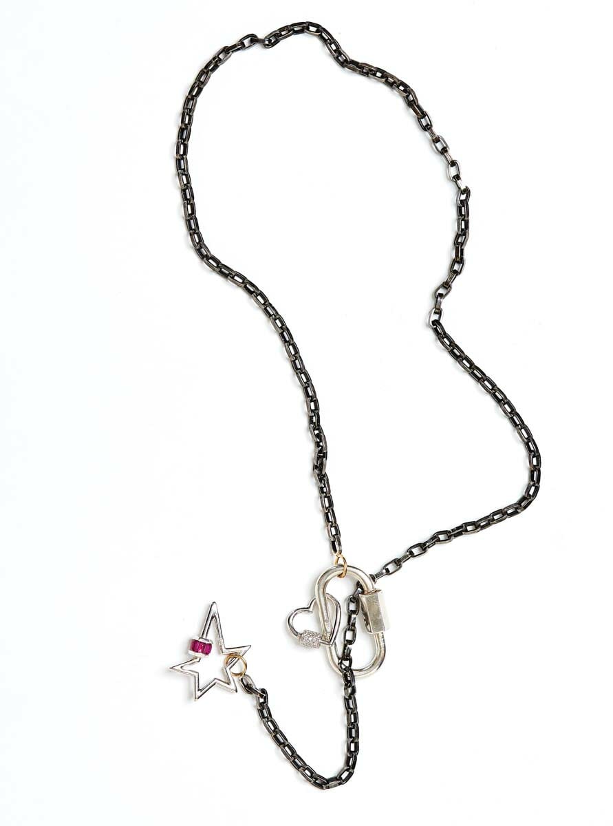 Designer Marla Aaron’s chains and charms are meant to mix and match, and the combinations are endless. We like her Biker Chain, silver with a black rhodium finish, available in multiple lengths. (The 24-inch is $262.) When it comes to add-ons, the choices are endless. Featured is a combination of the classic Regular lock in sterling, $275, with Stoned Baby Heartlock in white gold with diamonds, $1,863; and a Total Baguette Starlock in white gold with ruby, $2,950. Shop Ylang 23 for more options.