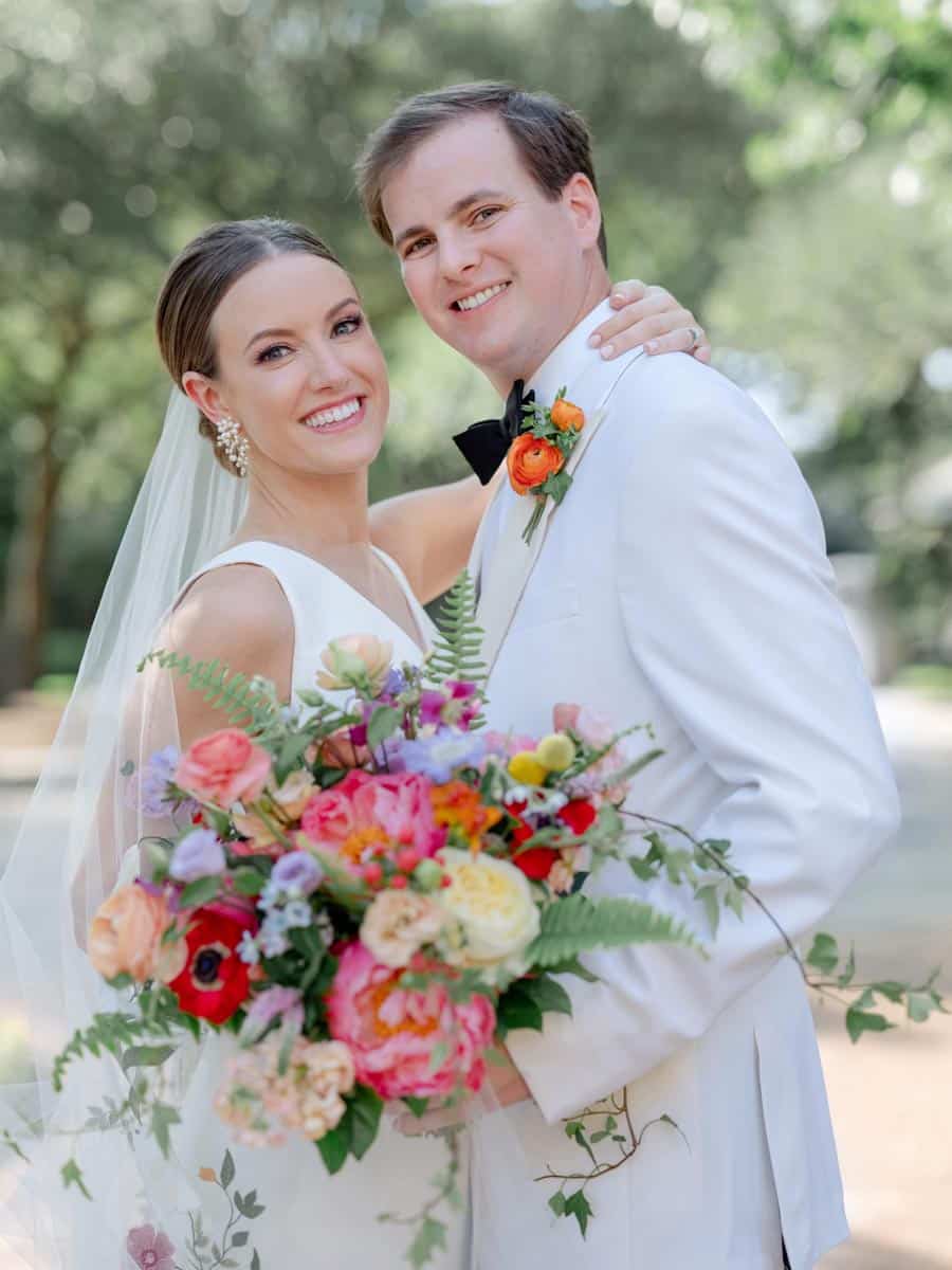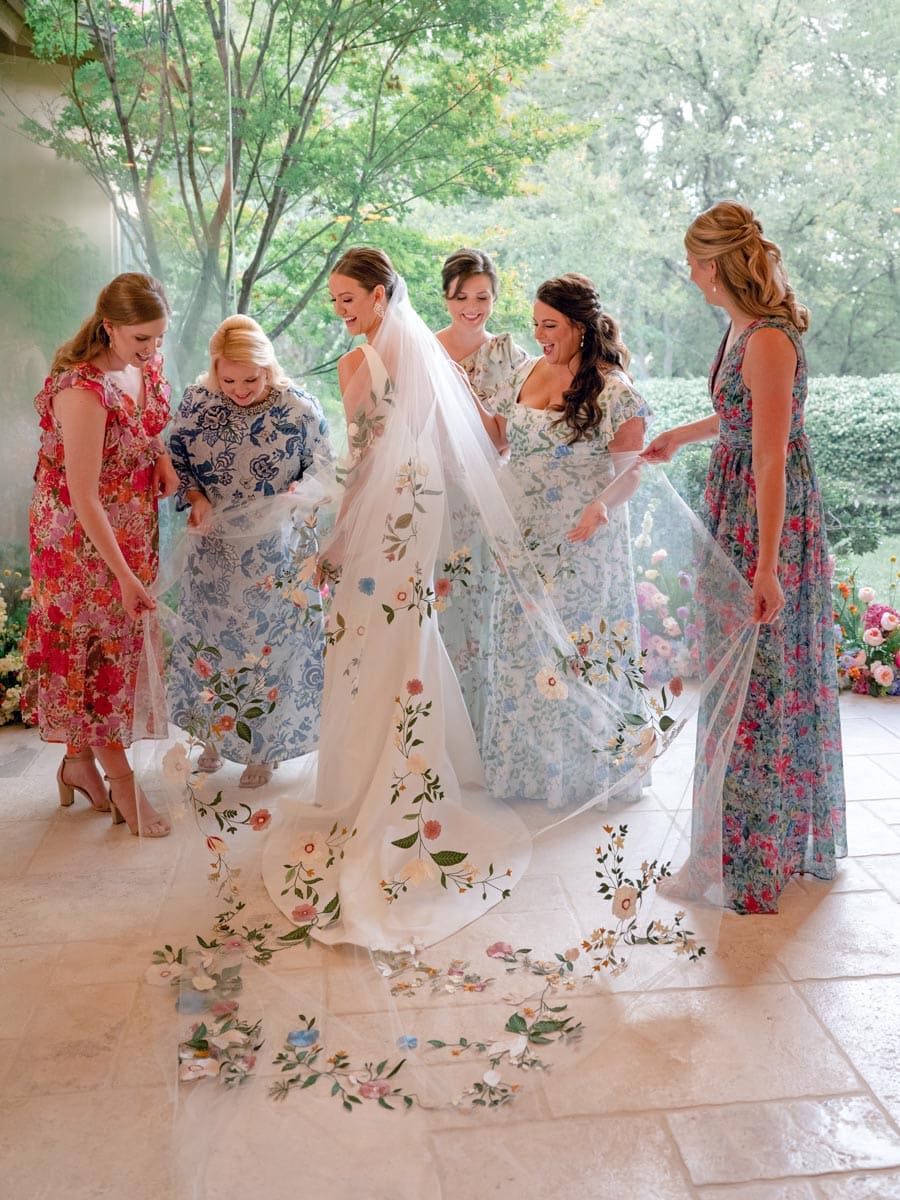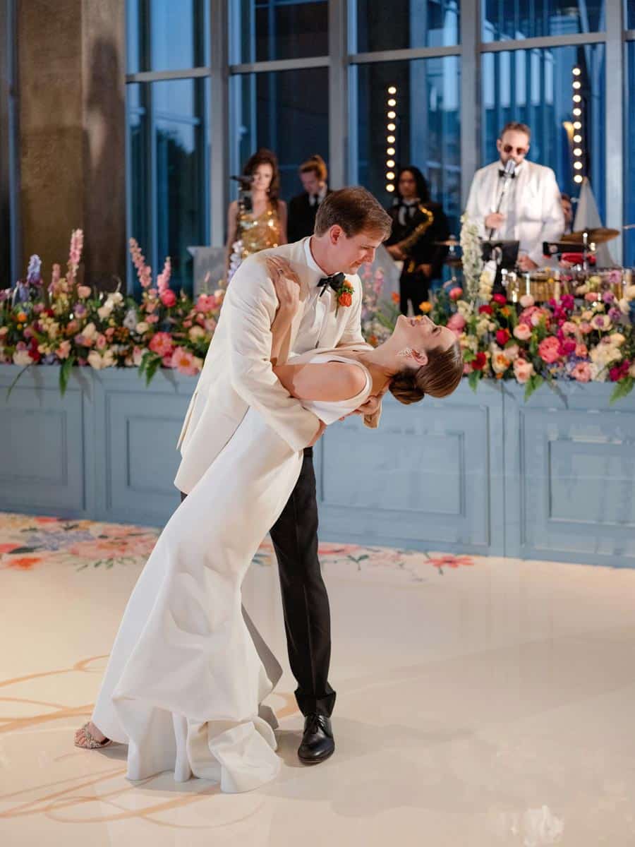 For the ceremony, the home was transformed into an indoor garden with dripping ivy and florals of all colors. The garden theme bloomed when Lizzy tried a stunning, intricate floral veil by Monique Lhuillier. “I’ve always loved vibrant colors, so the veil was the perfect addition to make my timeless dress stand out,” Lizzy says. Philip’s cousin, Cameron, officiated the wedding. After the ceremony, Philip and Lizzy were whisked away to the Modern, where 180 guests enjoyed a cocktail hour followed by a seated dinner by Wolfgang Puck Catering and music by the Jordan Kahn Orchestra. From the invitations to the bridesmaid dresses to the custom floral dance floor, the vibrant garden theme carried from the ceremony to the reception seamlessly. Prior to their exit in a vintage white Jaguar, Philip and Lizzy enjoyed a private dance to “Latch” by Sam Smith. “I will never forget the incredible feeling as I was overcome with both gratitude and love for my husband and relief that all the planning had been worth it,” she says.