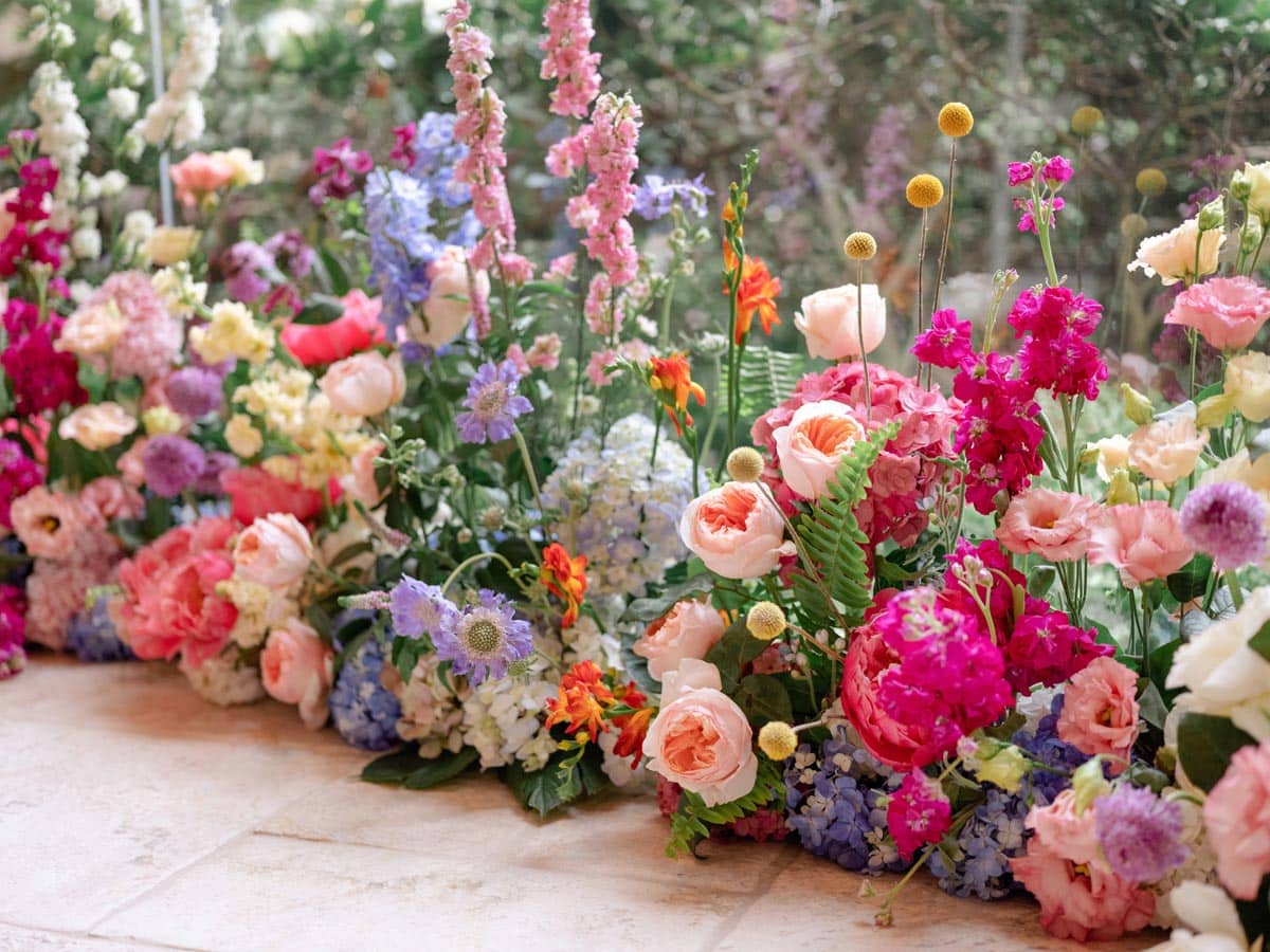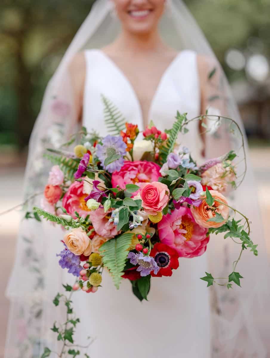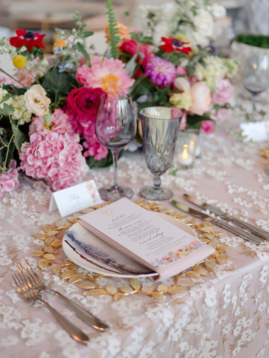 For the ceremony, the home was transformed into an indoor garden with dripping ivy and florals of all colors. The garden theme bloomed when Lizzy tried a stunning, intricate floral veil by Monique Lhuillier. “I’ve always loved vibrant colors, so the veil was the perfect addition to make my timeless dress stand out,” Lizzy says. Philip’s cousin, Cameron, officiated the wedding. After the ceremony, Philip and Lizzy were whisked away to the Modern, where 180 guests enjoyed a cocktail hour followed by a seated dinner by Wolfgang Puck Catering and music by the Jordan Kahn Orchestra. From the invitations to the bridesmaid dresses to the custom floral dance floor, the vibrant garden theme carried from the ceremony to the reception seamlessly. Prior to their exit in a vintage white Jaguar, Philip and Lizzy enjoyed a private dance to “Latch” by Sam Smith. “I will never forget the incredible feeling as I was overcome with both gratitude and love for my husband and relief that all the planning had been worth it,” she says.