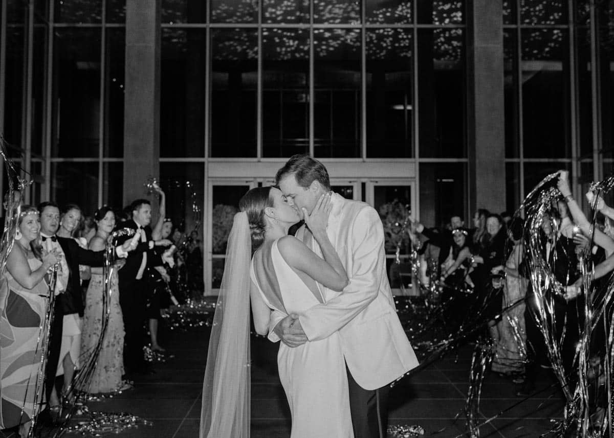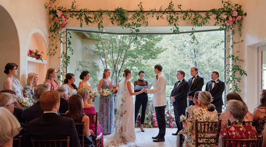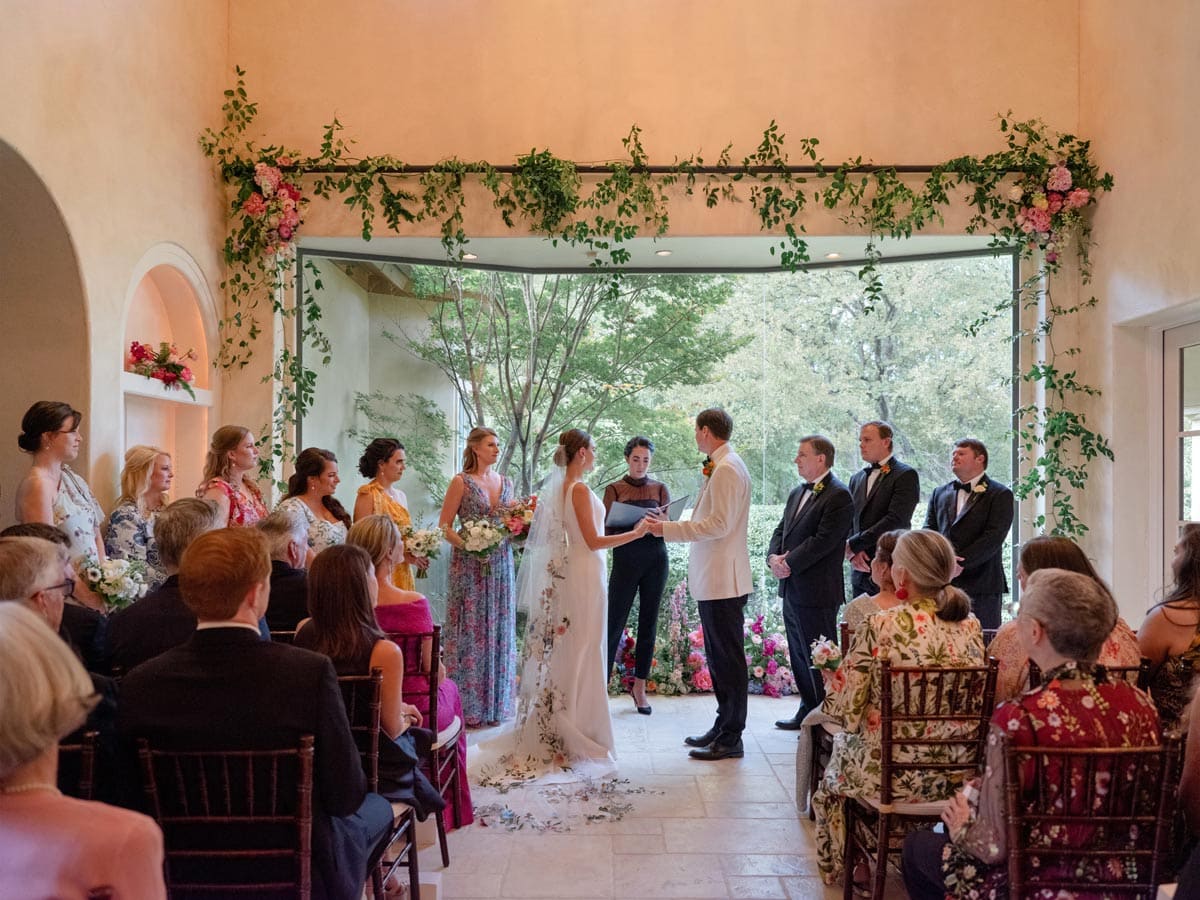 While Lizzy and Philip technically met in middle school, they had their first conversation in their 30s. They were distant admirers on Facebook until they matched on a dating app in 2020. While discussing their dream wedding, Philip expressed a preference for a small and intimate ceremony, while Lizzy knew their Fort Worth roots might lead to a grander event. They achieved both desires on Aug. 27, 2022: a small intimate ceremony of less than 50 at Lizzy’s childhood home and a larger reception at the Modern Art Museum of Fort Worth.