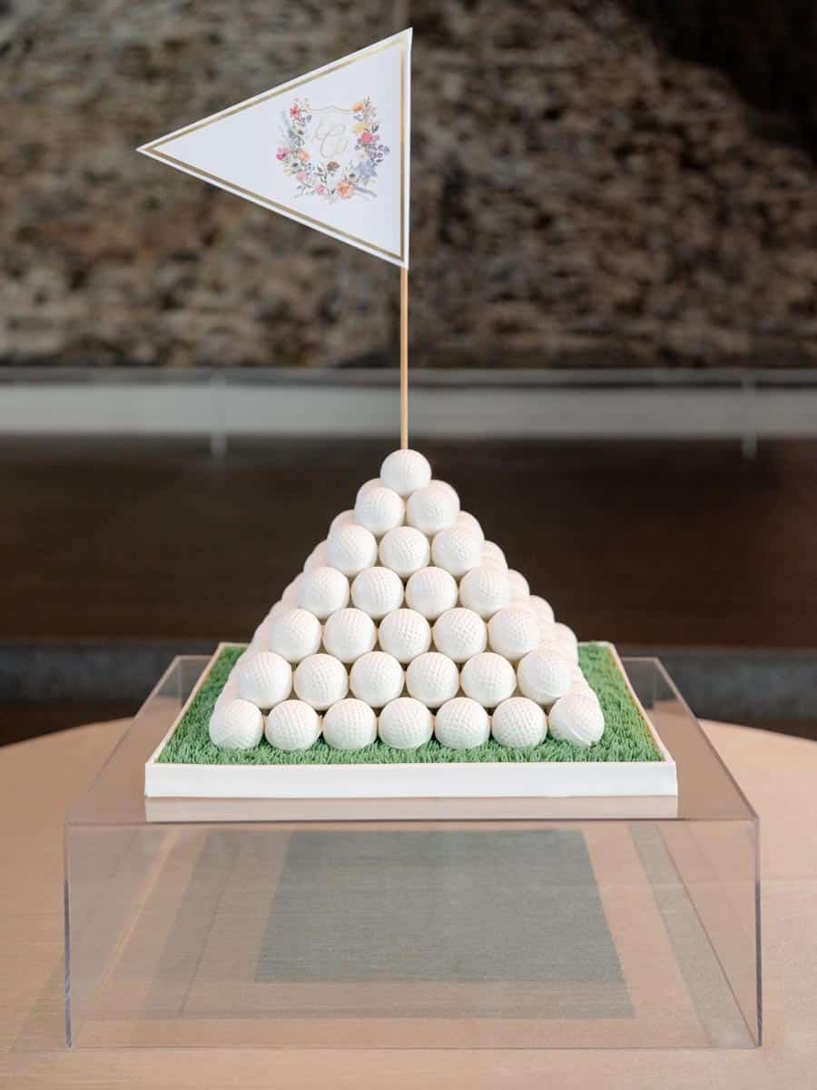 HOLE IN ONE The groom’s “cake” was made of 140 cake balls stacked to look like a pyramid of golf balls. STARRY NIGHT Although the reception was indoors, the Modern’s ceiling projection depicting a starry night transformed the Modern into an outdoor oasis. PARTY FAVORS Party favors on the dance floor included colorful fans to keep guests cool during the Texas heat, as well as light-up floral crowns and foam sticks.