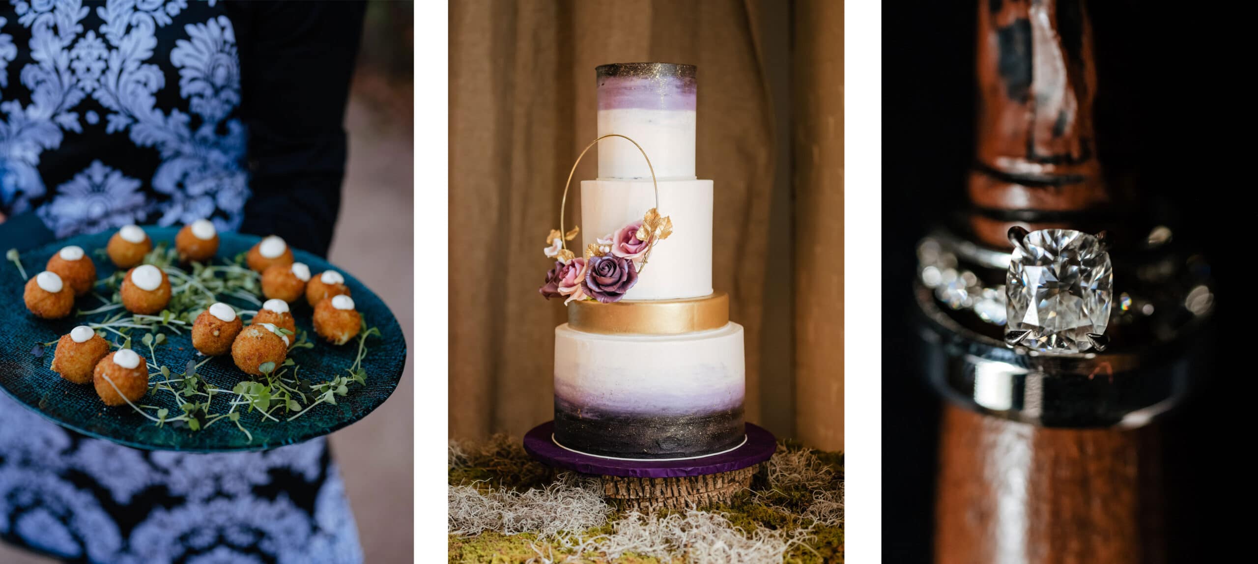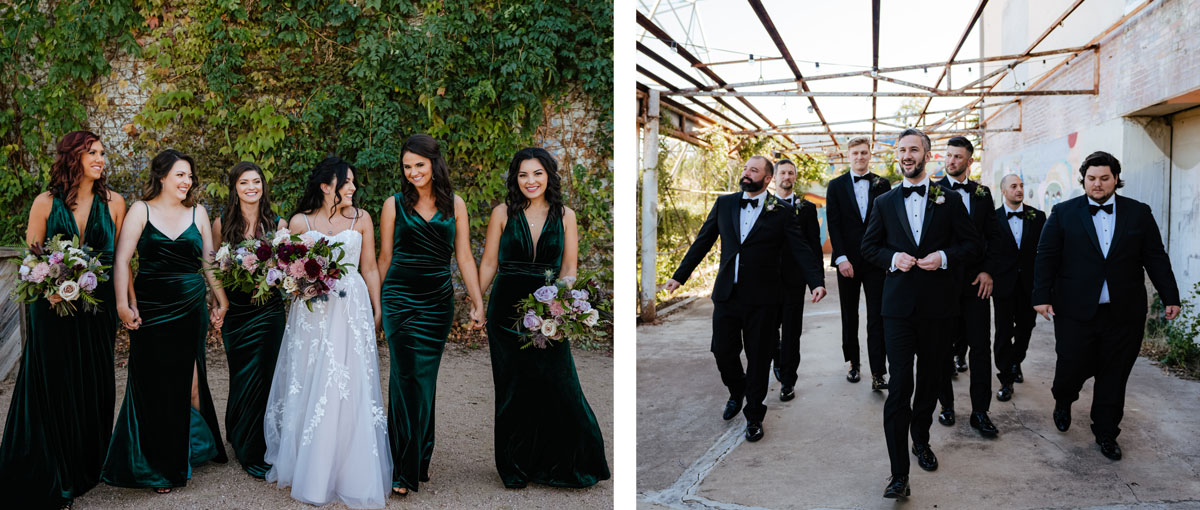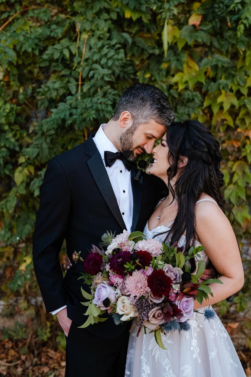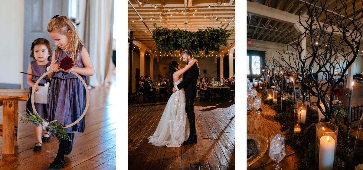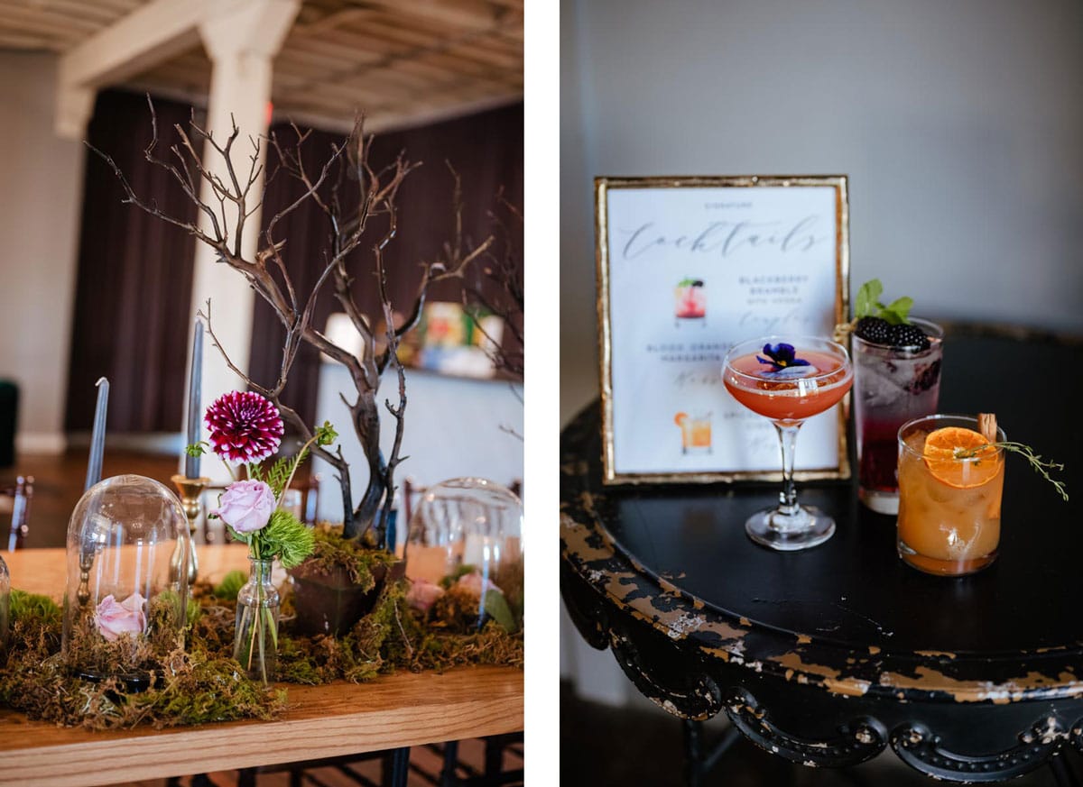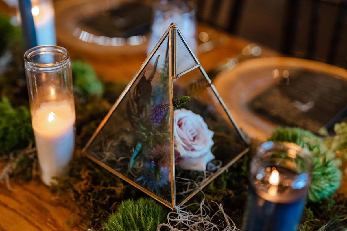 Megan and Chris love fantasy books and wanted a dark, moody color palette for their wedding. With this in mind, they came up with a magical forest theme using dark green, black, deep purple and gold.