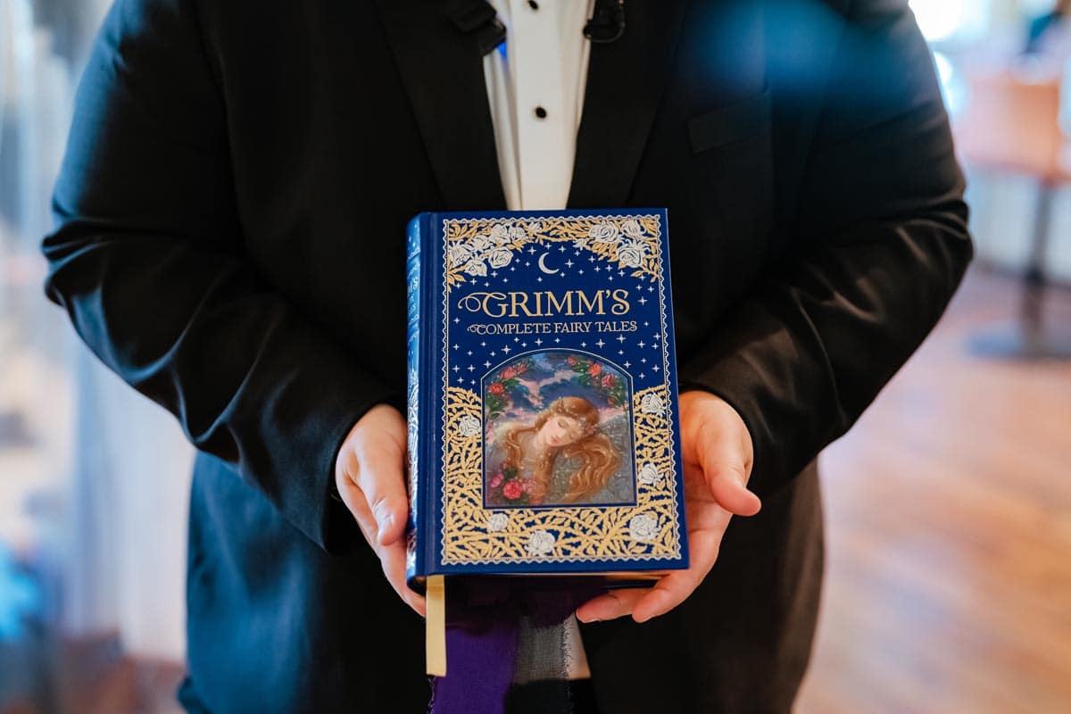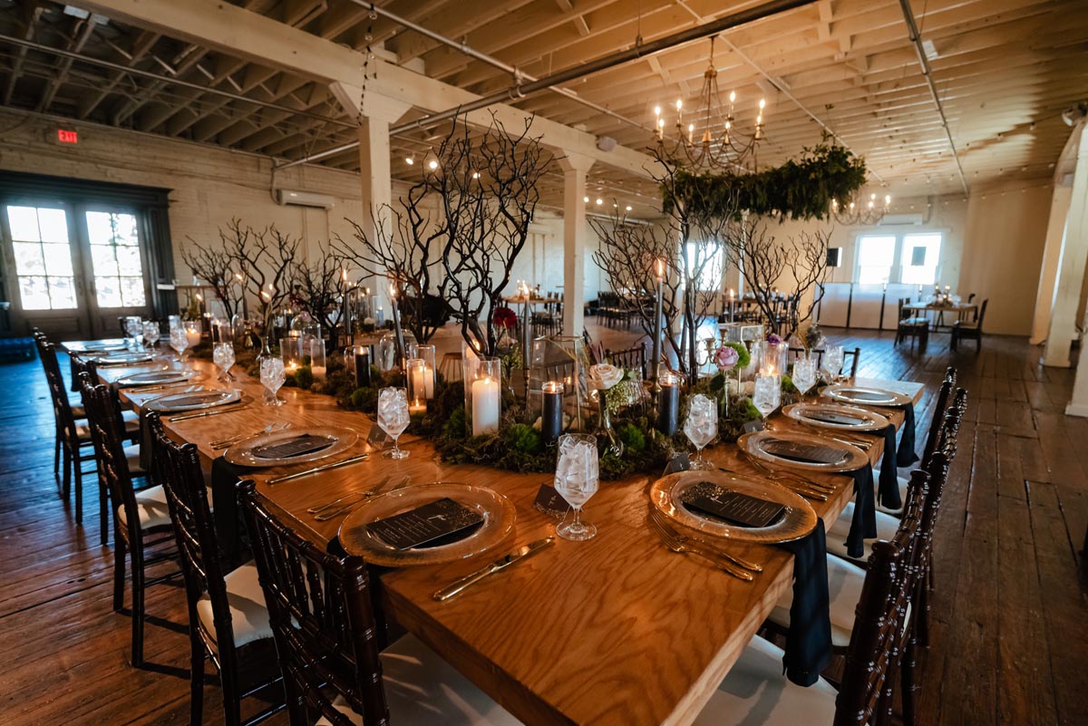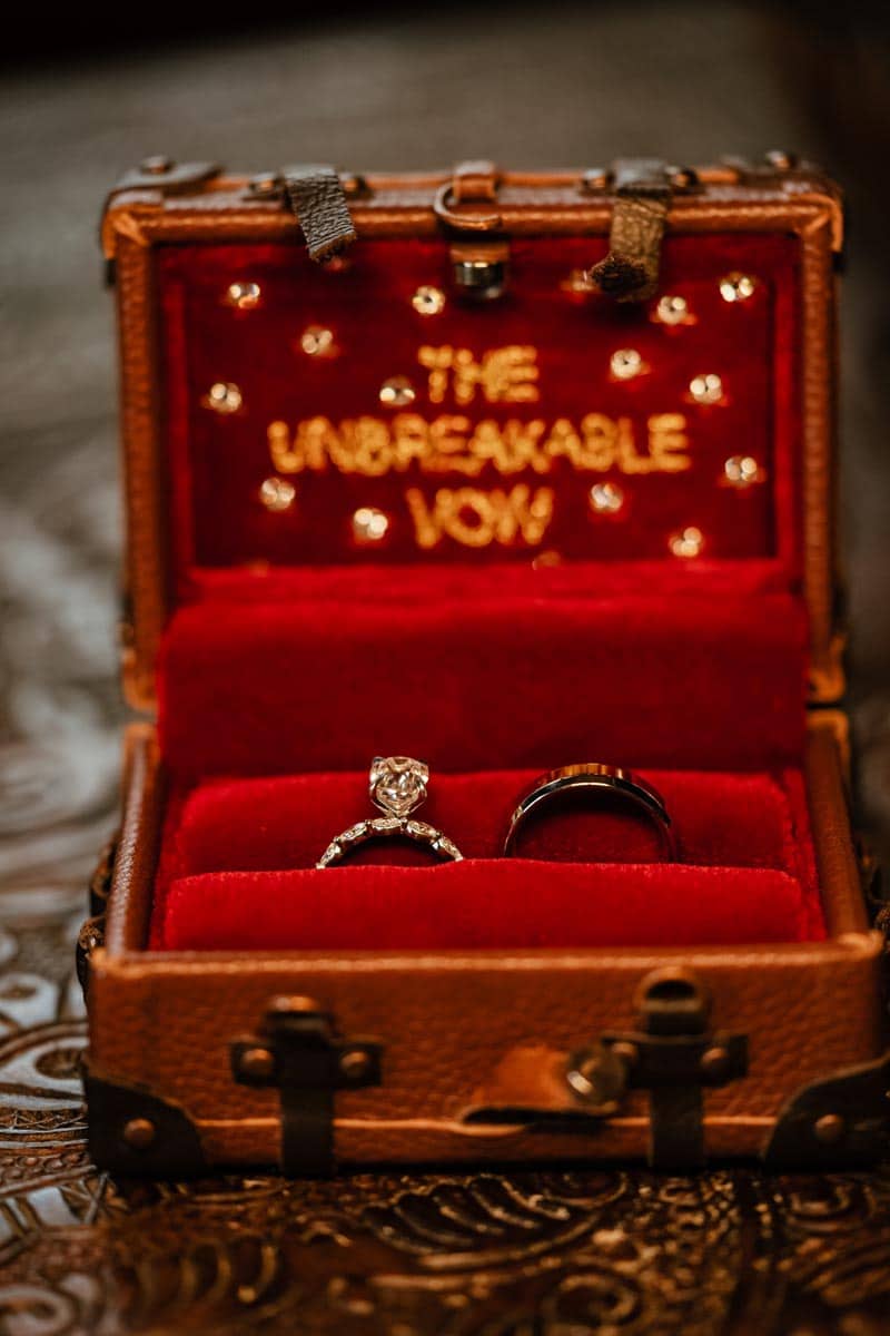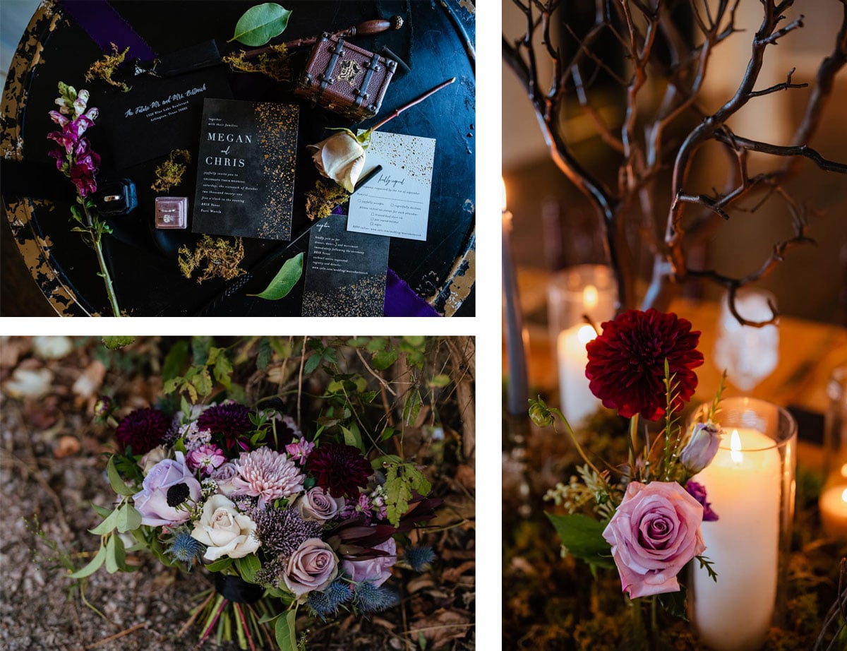 Every detail of their wedding lent itself to the magical theme. Their stationery was black with metallic gold accents and the font was reminiscent of quill writing. They loved the idea of having long tables for a “feast style” reception. The music during the ceremony and reception was personalized and included string versions of “Imperial March” from Star Wars and “Hedwig’s Theme” from Harry Potter. Megan’s brother officiated the wedding and tailored his script to fit their geeky, fantasy theme.