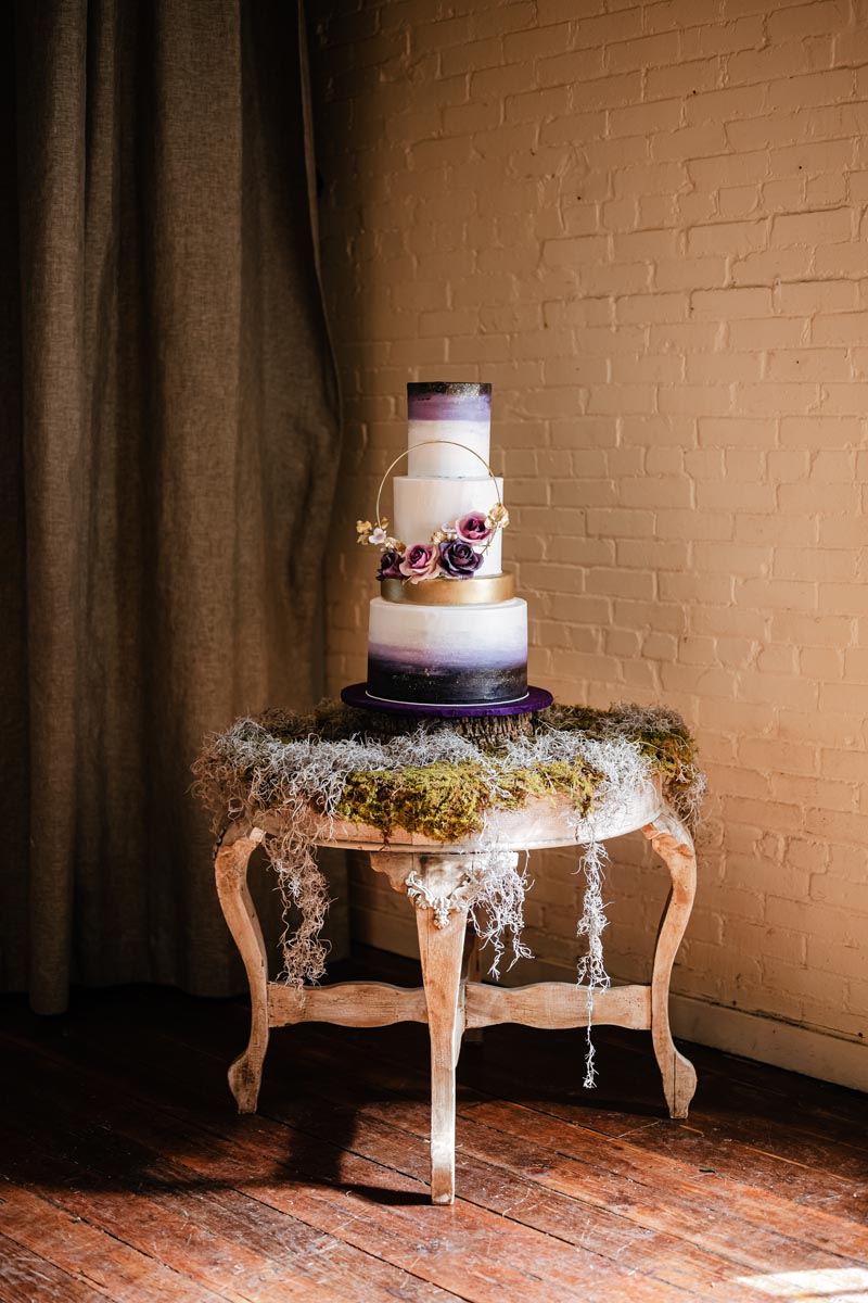 Vivienne & Vine went above and beyond to create the magical forest Megan wanted. A hanging installation with greenery and purple blooms served as the backdrop for the ceremony, and a large greenery grid hung above the dance floor at the reception. Moss, floral and black tree centerpieces topped the tables.