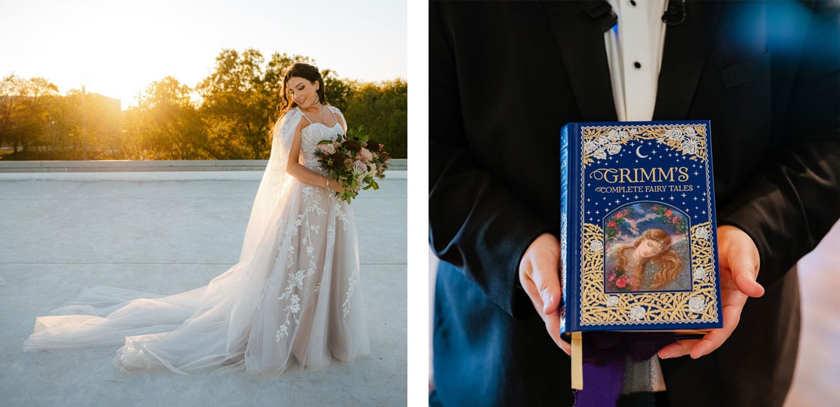 Megan wanted to feel like a princess from a fantasy novel, and her dress from Lang’s Bridal made her wish come true. Megan wore a matching cape instead of a veil. Her jewelry was nature-inspired, with floral, pearl and crystal details.