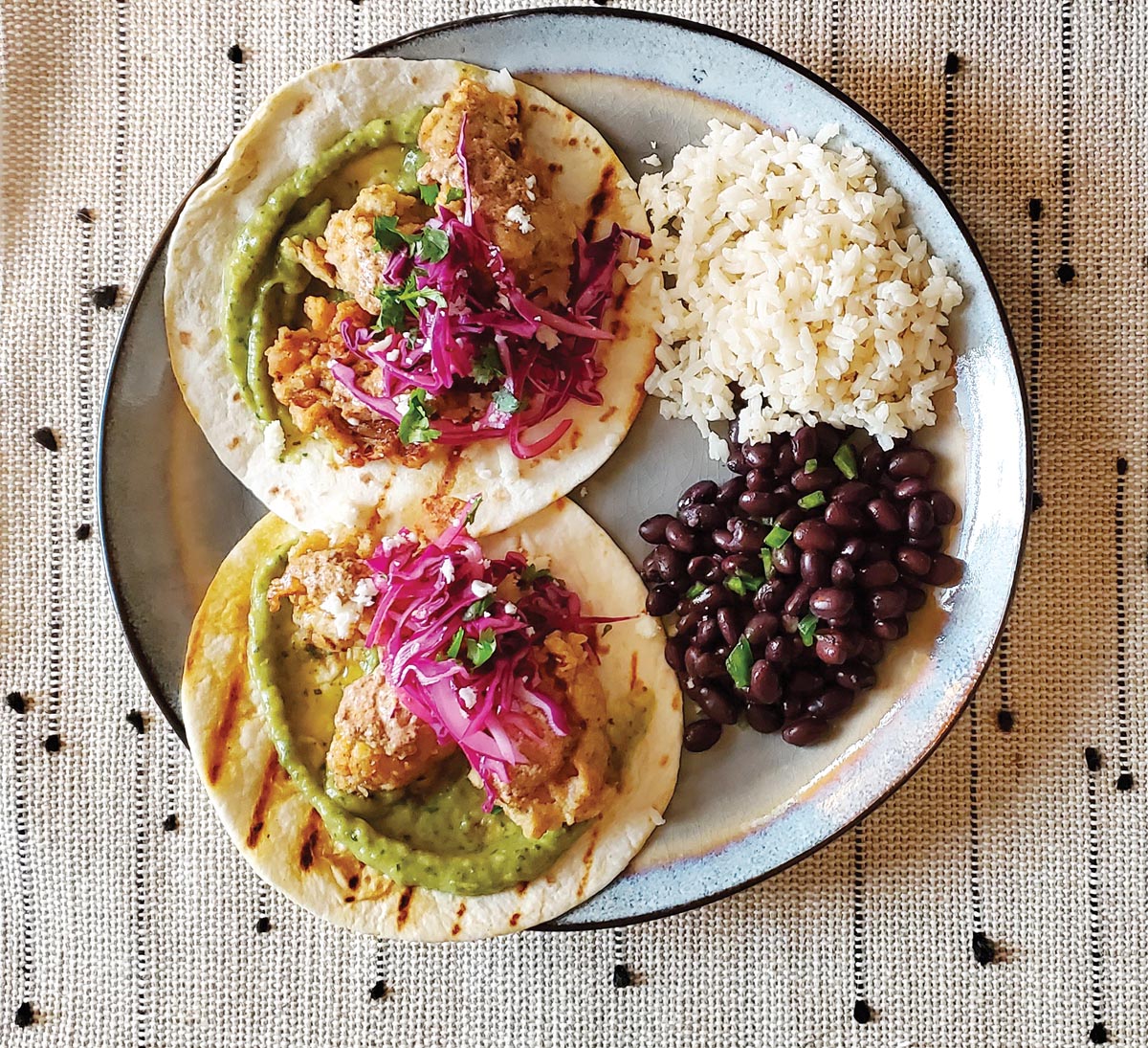 To serve, spread a warm tortilla with avocado mousse and top with pieces of fish. Drizzle with aioli and top with slaw. Serve two tacos per plate, with sides of rice and beans, garnished with chopped cilantro and queso fresco.